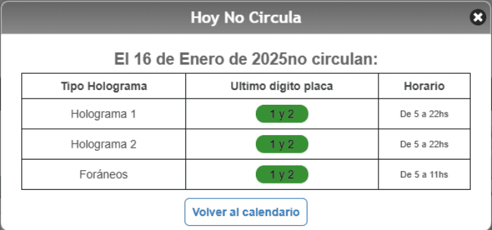 Para el día de mañana jueves 16 de enero del 2025 el programa Hoy No Circula en la Ciudad de México (CDMX) y el Estado de México (Edomex) aplicará para los siguientes autos: Mientras que los autos con los hologramas 00 y 0 están exentos de las limitaciones establecidas en el programa, así como los vehículos eléctricos e híbridos. Recuerda que el programa Hoy No Circula limita la circulación de los autos en función del último dígito de la placa y el color del engomado, con el objetivo de prevenir, minimizar y controlar la emisión de contaminantes a la atmósfera de la Zona Metropolitana del Valle de México. Para que mañana puedas tomar tus precauciones, te recordamos que el horario del Hoy No Circula es desde las 5:00 de la mañana a las 10:00 de la noche, sin embargo, para los automóviles con placas foráneas, la restricción será de 5:00 a 11:00 horas.El Hoy No Circula aplica en las 16 alcaldías de la CDMX y en 18 municipios de Edomex:NA