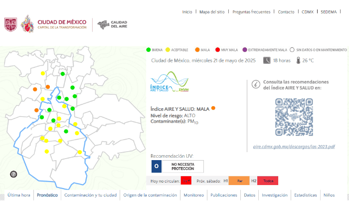 El programa Hoy No Circula limita la circulación de los autos en función del último dígito de la placa y el color del engomado, con el objetivo de prevenir, minimizar y controlar la emisión de contaminantes a la atmósfera de la Zona Metropolitana del Valle de México. Según el informe más reciente del Sistema de Monitoreo Atmosférico de la Ciudad de México (CDMX) con corte a las 18:00 horas, la calidad del aire en la capital del país y la zona conurbada es mala, por lo que existen condiciones para que se active la contingencia ambiental y el Doble Hoy No Circula para este jueves, por ello te recomendamos mantenerte pendiente de la información que proporcione la Comisión Ambiental de la Megalópolis (CAMe) en las próximas horas. Sin embargo, hasta la publicación de esta nota el programa Hoy No Circula aplica de forma habitual para el jueves 22 de mayo en la CDMX y el Edomex para lo siguientes autos: Mientras que los autos con los hologramas 00 y 0 están exentos de las limitaciones establecidas en el programa, así como los vehículos eléctricos e híbridos. Para que mañana puedas tomar tus precauciones, te recordamos que el horario del Hoy No Circula es desde las 5:00 de la mañana a las 10:00 de la noche, sin embargo, para los automóviles con placas foráneas, la restricción será de 5:00 a 11:00 horas.El Hoy No Circula aplica en las 16 alcaldías de la CDMX y en 18 municipios del Edomex:NA