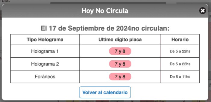 Después de un fin de semana largo, en conmemoración a la Independencia de México, las restricciones vehiculares como parte del Hoy No Circula continúan en la Ciudad de México (CDMX) y el Estado de México (Edomex).En ese sentido, el día de mañana martes 17 de septiembre los siguientes carros descansaran el la Zona Metropolitana del Valle de México:El horario del Hoy No Circula es desde las 5:00 de la mañana a las 10:00 de la noche, sin embargo para los automóviles con placas foráneas, la restricción será de 5:00 a 11:00 horas, por lo que te recomendamos tomar tus precauciones.El programa Hoy No Circula implementa restricciones parciales para la circulación de vehículos, tomando en cuenta los niveles de emisión y la antigüedad de los automóviles. Las limitaciones se determinan en función del último dígito de la placa y el color del engomado del vehículo. Además, en caso de contingencias ambientales, se pueden aplicar restricciones adicionales que dependen de la gravedad de la situación.El Hoy No Circula aplica en las 16 alcaldías de la CDMX y en 18 municipios de Edomex: NA