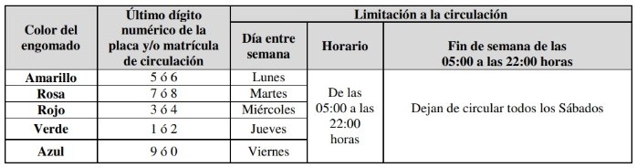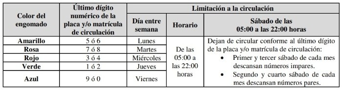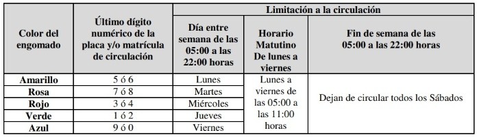 El programa "Hoy no circula" de la Ciudad de México (CDMX) busca minimizar la emisión de contaminantes provenientes de fuentes móviles o vehículos automotores, mediante la limitación de circulación conforme a la matrícula del vehículo, sin importar el origen de las placas, para contribuir a mejorar la calidad del aire.El "Hoy no circula" aplica para la Zona Metropolitana del Valle de México, que incluye las 16 alcaldías de la CDMX y 18 municipios conurbados del Estado de México: Atizapán de Zaragoza, Coacalco de Berriozábal, Cuautitlán, Cuautitlán Izcalli, Chalco, Chicoloapan, Chimalhuacán, Ecatepec de Morelos, Huixquilucan, Ixtapaluca, La Paz, Naucalpan de Juárez, Nezahualcóyotl, Nicolás Romero, Tecámac, Tlalneplantla de Baz, Tultitlán y Valle de Chalco. La circulación de los vehículos de uso particular, de carga, de transporte colectivo de pasajeros y taxis, que hayan obtenido en el proceso de verificación vehicular el holograma 1, se limita un día entre semana y dos sábados por cada mes, en un horario de las 05:00 a las 22:00 horas, con base en el último dígito numérico de la placa y/o matrícula de circulación y/o color de la calcomanía de circulación permanente (engomado), de conformidad con el siguiente calendario:En el caso de ambos hologramas, los vehículos que porten placa con más de una serie numérica el dígito a considerar para la limitación será el último de la primera serie de conformidad con los criterios de aplicación para placas establecidos. Dejan de circular 50% de los automotores administrativos de gobiernos locales, municipales, alcaldías y federal.Dejan de circular 100% de los automotores administrativos de gobiernos locales, municipales, alcaldías y federal.Dejan de circular el 20% de los hologramas "00", "0" de acuerdo a la terminación de su placa, nones o pares de holograma "1" y el 100% de los hologramas "2".Otorga un permiso a vehículos del extranjero o foráneos a la Ciudad de México y Estado de México, con una vigencia de 3, 7 ó 14 días, para fomentar el turismo permitiendo la circulación sin ninguna restricción, quedando exentos de lo establecido en el programa "Hoy no circula".Para obtener el Pase Turístico se deberá ingresar al portal electrónico de la Secretaría del Medio Ambiente de la Ciudad de México. Es necesario contar con una dirección de correo electrónico personal y tener la tarjeta de circulación del vehículo.Todos los automovilistas que infrinjan las medidas del programa "Hoy no circula", se hará acreedores a las sanciones establecidas en los reglamentos ambientales y de tránsito de la CDMX; que incluyen multas y retiro de vehículos a depósitos.OA