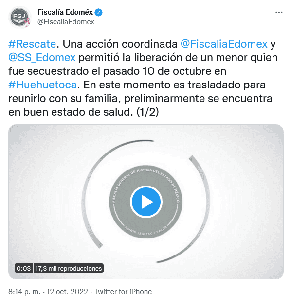 Después de varios cateos, autoridades del Estado de México rescataron al pequeño secuestrado en el municipio de Huehuetoca.Una acción coordinada de la Fiscalía y la Secretaría de Seguridad del Edomex permitió la liberación de un menor quien fue secuestrado el pasado 10 de octubre en el municipio de Huehuetoca.Elementos de la Secretaría de Seguridad estatal, localizaron al menor; reportaron que había una exigencia de pago de rescate que no se consumó.Desde el primer momento que se tomó conocimiento de los hechos, la SS del Edomex y la Fiscalía realizaron acciones conjuntas para lograr el rescate de la víctima siempre actuando con protocolos para preservar su integridad. La investigación sobre estos hechos, aseguraron, continúa.En videos que circulan en redes sociales se observa cómo madres de familia caminan de la mano de sus hijos rumbo a la escuela por una banqueta en calles del centro de Huehuetoca, cuando un auto pequeño tipo Chevy, color rojo bajan dos hombres delgados y con lujo de violencia jalan y se llevan a un niño, junto con su mochila y algunas pertenencias de la madre, para luego huir.Otra madre que iba caminando detrás con su hijo, retrocede y huye del lugar junto con el niño, en hechos que habrían ocurrido la mañana del pasado lunes 11 de octubre.OF