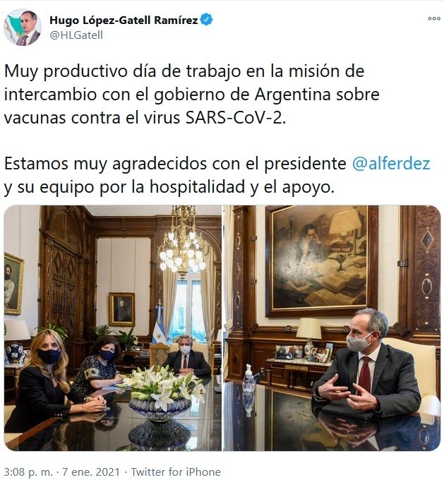 El subsecretario de Salud de México, Hugo López-Gatell, se reunió este jueves con el presidente de Argentina, Alberto Fernández, en Buenos Aires para analizar los planes de vacunación contra el coronavirus."Muy productivo día de trabajo en la misión de intercambio con el gobierno de Argentina sobre vacunas contra el virus SARS-CoV-2", dijo esta tarde López-Gatell en su cuenta de Twitter.Esta mañana, el Presidente Andrés Manuel López Obrador (AMLO) reveló que el subsecretario viajó a Argentina para explorar llevar la vacuna rusa Sputnik V y aplicarla en territorio nacional.La vacuna Sputnik-V, elaborada por el instituto estatal ruso Gamaleya, es por el momento la única que se está aplicando en Argentina, a personal de la salud, con la primera remesa de 300 mil dosis recibidas el 24 de diciembre.Fuentes del Gobierno argentino informaron que en el encuentro de Fernández con López-Gatell Ramírez y Efraín Guadarrama Pérez , director general de Organismos y Mecanismos Regionales Americanos de la Secretaría de Relaciones Exteriores mexicano, analizaron el acceso a las diferentes vacunas y el acuerdo firmado entre ambas naciones en 2020 para producir y distribuir la vacuna desarrollada por la Universidad de Oxford y el laboratorio AstraZeneca.En agosto pasado, el presidente argentino destacó que ese paso conjunto permitiría a los países de Latinoamérica acceder a la vacuna a precios accesibles, con un costo de entre 3 y 4 dólares por dosis."Es una gran noticia que México y Argentina sean los puntos referenciales para la producción de la vacuna y que podamos de este modo traer una solución al continente", subrayó entonces el presidente.En el encuentro, que se produjo en la Casa Rosada, sede del Gobierno en Buenos Aires, Fernández estuvo acompañado por la secretaria de Acceso a la Salud, Carla Vizzotti, y la asesora presidencial Cecilia Nicolini."Además, hubo coincidencias en la necesidad de que tiene que haber una respuesta desde el Estado ante el avance del virus y en la importancia de la cooperación entre las dos naciones", según la información difundida.México, que acumula alrededor 1.5 millones de casos de covid-19 y casi 130 mil muertes, cumple dos semanas de iniciar su vacunación, tras haber recibido unas 100 mil dosis de la vacuna de Pfizer y BioNTech.IM