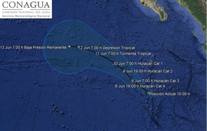 El huracán ''Aletta'' se intensificó a categoría 4 y ubica en el océano Pacífico, a 335 kilómetros al sur de Isla Socorro y a 815 kilómetros de Manzanillo, Colima, informó el Servicio Meteorológico Nacional (SMN).En su reporte, el organismo de la Comisión Nacional del Agua (Conagua) dio a conocer que el meteoro registra vientos sostenidos 220 kilómetros por hora y rachas de 270 kilómetros por hora.Precisó que su circulación refuerza el potencial de lluvias muy fuertes en Jalisco, Colima y Michoacán, y puntuales fuertes en Nayarit.Ante ello, recomendó a la población en las zonas de los estados mencionados extremar precauciones por lluvias, viento y oleaje (incluyendo la navegación marítima) y atender las recomendaciones emitidas por las autoridades del Sistema Nacional de Protección Civil, en cada entidad.OF