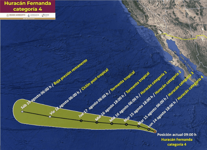 El huracán "Fernanda" se intensificó a categoría 4 en la escala Saffir-Simpson y se localiza al suroeste de la Península de Baja California, informó este lunes el Servicio Meteorológico Nacional (SMN), fuente oficial del Gobierno de México en materia climática.Según el SMN, el huracán "Fernanda" se encuentra a mil 195 km al suroeste de Cabo San Lucas, Baja California Sur. Su desplazamiento actual es hacia el oeste (280°) a 13 km/h y tiene vientos sostenidos de 215 km/h y rachas de 260 km/h.Además, la autoridad compartió, a través de un aviso, que debido a su distancia y trayectoria, "Fernanda" no representa peligro para el territorio nacional, por lo que no afecta a ningún estado.De acuerdo a las proyecciones, el sistema continuará con la categoría 4 como huracán hasta este lunes alrededor de las 18:00 horas, cuando se debilite poco a poco hasta que el próximo miércoles se convierta en una tormenta tropical, cuando se encuentre aún más lejos de México, a mil 805 km al suroeste de Punta Eugenia, BCS.Cielo medio nublado y ambiente templado por la mañana. Cielo nublado durante la tarde con lluvias puntuales muy fuertes en Nayarit, Jalisco, Colima y Michoacán; las cuales estarán acompañadas de descargas eléctricas, rachas fuertes de viento y posible caída de granizo, las cuales podrían reducir la visibilidad, originar el incremento en niveles de ríos y arroyos, así como generar deslaves, inundaciones y encharcamientos. Ambiente cálido a caluroso por la tarde. Viento de dirección variable de 10 a 25 km/h con rachas de 30 a 40 km/h en la región, y rachas de 40 a 60 km/h con posibles tolvaneras en zonas de Jalisco.Con información del Servicio Meteorológico Nacional OA