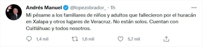 El Presidente Andrés Manuel López Obrador (AMLO) envió sus condolencias a los familiares de niños y adultos que fallecieron tras el paso del huracán "Grace" en Veracruz.A través de su cuenta de Twitter, AMLO expresó a las familias que cuentan con el apoyo del gobernador de la entidad y del Gobierno Federal."No están solos. Cuentan con Cuitláhuac y todos nosotros", fue parte de su mensaje.Si te interesó esta noticia y quieres saber más, entonces descarga y descubre INFORMAPlus, la aplicación digital de EL INFORMADOR, en donde tenemos contenidos exclusivos, seleccionados por nuestros editores, para darles una experiencia más completa a los lectores. Si eres suscriptor de EL INFORMADOR tu acceso está incluido, solicítalo al 33 3678-7777Descarga la aplicación y pruébala GRATIS por treinta días.Para iOS: https://apple.co/35jaVgbPara Android: https://bit.ly/3gwVSEVJM