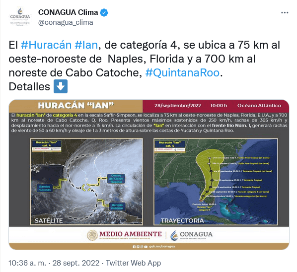 El huracán "Ian", ahora un peligroso ciclón de categoría 4, se encuentra próximo a la Península de Florida, Estados Unidos, pero sus bandas nubosas en interacción con el aire frío del frente frío número 1 generarán vientos y oleaje en la Península de Yucatán.De acuerdo con información del Sistema Meteorológico Nacional, el huracán "Ian" provocará rachas de viento de 50 a 60 km/h y oleaje de 1 a 3 metros de altura en las costas de Campeche, Yucatán y Quintana Roo.Se espera que por el frente frío número 1 se genere un evento de "Norte" con rachas de 70 a 80 km/h en costas de Veracruz e Istmo y Golfo de Tehuantepec, en donde también se prevén lluvias torrenciales en Chiapas, además de fuertes a intensas en el sur y sureste del territorio nacional; así como rachas de viento de 50 a 60 km/h en el litoral de Tamaulipas, Tabasco, Campeche, Yucatán y Quintana Roo.OF