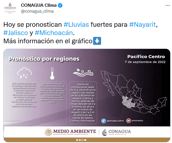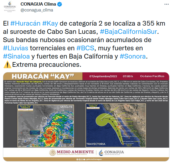 Este miércoles el huracán "Kay" se intensificó a categoría 2 y mantendrá las lluvias torrenciales en Baja California Sur.De acuerdo con el Sistema Meteorológico Nacional (SMN) de la Comisión Nacional del Agua (Conagua), el huracán "Kay" se desplazará paralelo a la costa occidental de Baja California Sur y en interacción con el monzón mexicano, originarán lluvias puntuales torrenciales en Baja California Sur y puntuales fuertes en Baja California.A su vez, sus extensas bandas nubosas producirán lluvias puntuales fuertes en Sonora y puntuales muy fuertes en Sinaloa. Asimismo, ocasionará intensas rachas de viento con oleaje elevado en las costas de los estados mencionados.Por su parte, canales de baja presión, uno extendido en el noreste, norte y centro del país y otro en el sureste de México, en combinación con la entrada de humedad de ambos litorales, ocasionarán lluvias puntuales fuertes a muy fuertes en los estados de la Mesa del Norte, Mesa Central y entidades del centro y sur del litoral del Pacífico, además de chubascos en Colima y la Península de Yucatán.Las lluvias estarán acompañadas de descargas eléctricas, rachas de viento y posible caída de granizo, mismas que podrían incrementar los niveles de ríos y arroyos y ocasionar deslaves e inundaciones en zonas bajas.Finalmente, continuará el ambiente vespertino templado a cálido en la mayor parte del país, siendo caluroso en zonas de Campeche y Yucatán, y con temperaturas máximas muy calurosas, mayores a 40°C sobre el noreste de Baja California y el noroeste de Sonora.El Gobierno de México hizo un llamado a la población a extremar precauciones por el impacto del huracán "Kay", que se desplaza paralelo a la Península de Baja California, y la tarde del miércoles advirtió que este podría convertirse en categoría 3.La coordinadora general del SMN, Alejandra Méndez Girón, explicó en conferencia virtual que, aunque el huracán no toque tierra, sus efectos se sentirían sobre la península."Su cercanía es como si el huracán lo tuviera encima de la península. Los efectos se sienten dentro de la península y hay que enfatizar que es en la pared [del ciclón] en donde se tiene mayor cantidad de precipitación y de vientos más intensos, por eso hay que enfocarse sobre las bandas nubosas que podrían dejar hasta puntuales máximos de 350 milímetros desde hoy hasta el sábado", expuso.En Baja California Sur, las autoridades anunciaron el cierre de puertos de los cinco municipios a toda la navegación menor, el cierre del Aeropuerto Internacional de La Paz, además de que se inició la apertura de albergues en Los Cabos, Mulegé y La Paz.En Colima, por el alto oleaje, el puerto de Manzanillo fue cerrado a la navegación de embarcaciones pequeñas y para la actividad turística, además se alertó a la población de la entidad y a quienes se encuentran en los municipios de Armería, Tecomán y Manzanillo, pues el oleaje elevado en todas las costas ya ha provocado que el agua ingrese a algunas ramadas, por lo que sus propietarios han tenido que sacar todas sus cosas por la marea.En la bahía de Manzanillo, el agua ha ingresado a algunas calles aledañas a la franja costera, generando, incluso, encharcamientos en el boulevard costero Miguel de la Madrid.En Sinaloa, en los municipios de Culiacán, Concordia, Elota y El Fuerte fueron desalojadas 76 familias por inundaciones y las clases permanecen suspendidas, además de que los puertos de Topolobampo y Mazatlán fueron cerrados a la navegación.OA