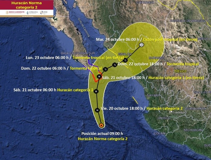 "Norma" se ha debilitado a huracán categoría 2 en la escala Saffir-Simpson, pero aún representa peligro en su camino a Baja California Sur, informó esta mañana de viernes el Servicio Meteorológico Nacional (SMN), fuente oficial del Gobierno de México.Durante el sábado, el huracán "Norma" se localizará muy cerca del sur de la Península de Baja California, pudiendo impactar durante la tarde noche de este día en dicha región. Su extensa circulación ocasionará lluvias puntuales torrenciales en Baja California Sur, Sinaloa y Nayarit; lluvias intensas en Jalisco y Colima; muy fuertes en Michoacán; además de chubascos y lluvias fuertes sobre Sonora, Chihuahua, Durango, Zacatecas y Aguascalientes. Asimismo, se pronostican rachas de viento de 120 a 140 km/h y oleaje de 4 a 6 metros de altura en las costas de Baja California Sur, Sinaloa y Nayarit; y rachas de 80 a 100 km/h y oleaje de 2 a 4 metros de altura en las costas de Jalisco y Colima. Se activa para: Sur de Baja California SurSe activa para: Centro de Baja California Sur; Centro-Norte, Centro-Sur y Centro de SinaloaSe activa para: N de BCS; S de Chihuahua; Oeste de Dur; N y S de SinSe detectan la presencia de un ciclón tropical que se dirige a nuestras costas Permanece atento a la información meteorológicaSe activa para: Suroeste y Sureste de Chih; Noroeste, N, S y Centro de Dur; Noroeste y Suroeste de Jal; N, S y Oeste de Nay; S de SonCon información del Servicio Meteorológico Nacional* * * Mantente al día con las noticias, únete a nuestro canal de Whatsapp * * *OA