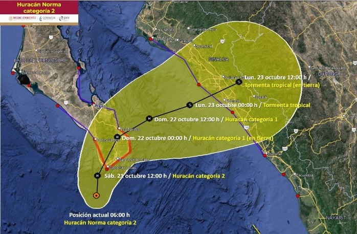 El huracán "Norma" originará condiciones favorables para que se registren lluvias puntuales extraordinarias en el sur de Baja California Sur, informó el Servicio Meteorológico Nacional (SMN), fuente oficial del Gobierno de México.Este sábado, se pronostica que el centro del ciclón tropical "Norma", de categoría 2 en la escala Saffir-Simpson, toque tierra entre las 08:00 y las 10:00 horas en las inmediaciones de Cabo San Lucas, Baja California Sur, originando lluvias puntuales extraordinarias con intensas rachas de viento de 120 a 140 km/h y oleaje elevado de 7 a 9 metros de altura en las costas de dicho estado, a su vez, sus extensas bandas nubosas propiciarán lluvias puntuales muy fuertes en el occidente de México y lluvias puntuales torrenciales con intensas rachas de viento de 90 a 110 km/h y oleaje de 4 a 6 metros de altura en las costas de Sinaloa y Nayarit.Dichas lluvias se acompañarán de descargas eléctricas y podrían incrementar los niveles de ríos y arroyos, así como generar deslaves e inundaciones en zonas bajas. Asimismo, "Norma", ocasionará chubascos y lluvias fuertes en estados del noroeste y norte del territorio nacional.Por otra parte, canales de baja presión, el primero sobre el occidente y centro del país, y el segundo en el sureste mexicano, aunado a la entrada de humedad de ambos litorales, generarán chubascos y lluvias puntuales fuertes en dichas regiones, presentándose lluvias puntuales muy fuertes en Chiapas. Las lluvias mencionadas estarán acompañadas de descargas eléctricas.Finalmente, una zona de baja presión con potencial ciclónico, se ubicará al sur de las costas de Oaxaca y Chiapas, reforzando el potencial de lluvias en el sureste mexicano.Las lluvias estarán acompañadas con descargas eléctricas y posible caída de granizo; además, las lluvias fuertes, muy fuertes a extraordinarias, podrían originar visibilidad reducida, deslaves, encharcamientos o inundaciones, así como incremento en los niveles de ríos y arroyos.Con información del Servicio Meteorológico Nacional* * * Mantente al día con las noticias, únete a nuestro canal de Whatsapp * * *OA