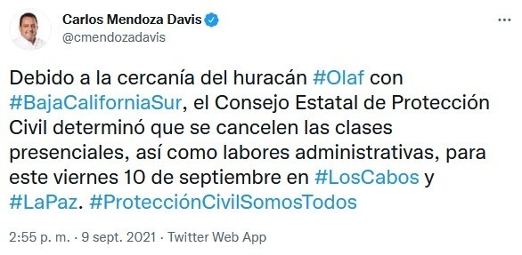 Por la aproximación del huracán "Olaf", de categoría 1, autoridades de México emitieron la alerta roja o de peligro máximo para el Centro y Sur del estado de Baja California Sur, a donde se prevé que ingrese como categoría 2.Con la alerta roja se llama al resguardo total de la población y atender las instrucciones de las autoridades.Autoridades indican que el ciclón puede lanzar objetos sueltos y dañar la integridad de las personas; piden evitar ventanales de frente al viento"Se espera toque tierra entre los municipios de Los Cabos y La Paz, B.C.S., muy probablemente como huracán categoría 2, aproximadamente entre las 22:00 h de hoy y las 01:00 h de mañana", dijo el Servicio Meteorológico Nacional (SMN) en un comunicado de las 4:15 PM.Según el SMN, a las 4:00 PM de este jueves el centro de "Olaf" se localizó a 130 kilómetros al sureste de Cabo San Lucas, Baja California Sur, con vientos sostenidos máximos de 150 kilómetros por hora (km/h) y rachas de 185 km/h."Olaf" segurirá afectando a la Península durante el viernes y, para el sábado, se espera que recurve hacia el occidente.A su paso, provocará lluvias torrenciales en Baja California Sur, en los municipios de Los Cabos, La Paz, Comondú y Loreto. El gobernador de Baja California Sur, Carlos Mendoza Davis, informó que determinó que debido al huracán "Olaf", el viernes 10 de septiembre se cancelarán clases presenciales, así como labores administrativas, en Los Cabos y La Paz.A través de sus redes sociales, también dijo que los albergues están listos para abrirse, en caso de así se requiera.Si te interesó esta noticia y quieres saber más, entonces descarga y descubre INFORMAPlus, la aplicación digital de EL INFORMADOR, en donde tenemos contenidos exclusivos, seleccionados por nuestros editores, para darles una experiencia más completa a los lectores. Descarga la aplicación y pruébala GRATIS por treinta días. Para iOS: https://apple.co/35jaVgbPara Android: https://bit.ly/3gwVSEVSi eres suscriptor de EL INFORMADOR tu acceso está incluido, solicítalo al 33 3678-7777IM
