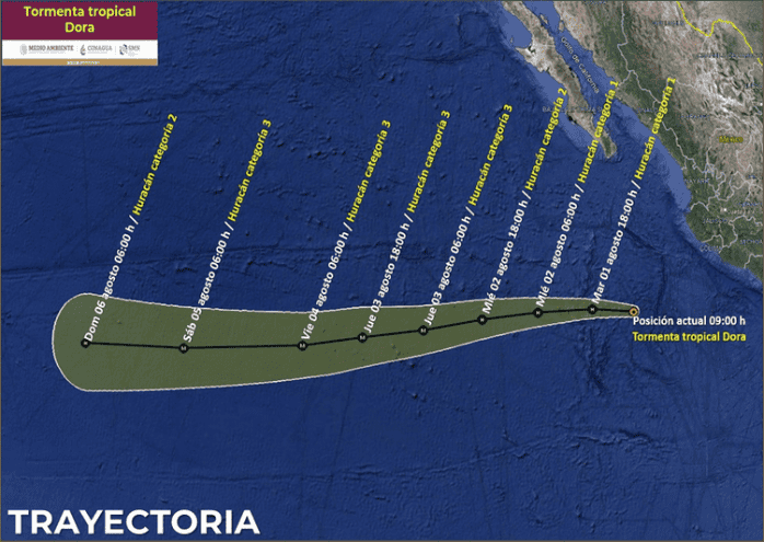 "Dora" se convirtió este martes en tormenta tropical, pero sigue avanzando y podría alcanzar la categoría 3 como huracán, lo que lo convierte en un fenómeno altamente peligroso, con velocidad de hasta 209 kilómetros por hora y olas de hasta 3.6 metros, sin que represente alerta para México, pues se aleja de sus costas.De acuerdo a información del Servicio Meteorológico Nacional (SMN), con actualización hasta las 09:00 horas, "Dora" se convertiría en huracán hoy mismo alrededor de las 18:00 horas, alcanzando la categoría 1. El ciclón tropical seguiría avanzando, adentrándose en el Océano Pacífico, hasta llegar a la categoría 2, el miércoles 2 de agosto; y, finalmente, la categoría 3 a partir del jueves 3 de agosto, aunque ya estaría muy lejos de las cotas de México. La situación actual de la tormenta tropical "Dora", informó el SMN, es que se desplaza hacia el oeste, alejándose de costas mexicanas. Refuerza la probabilidad de lluvias en Jalisco, Colima y Michoacán.En este momento, "Dora" se encuentra a 560 km al suroeste de Manzanillo, Colima, su punto más cercano en México. Se desplaza hacia el oeste (280°) a 26 km/h.Las autoridades pidieron extremar precauciones a la población en general en las zonas de los estados mencionados por lluvias y atender las recomendaciones emitidas por las autoridades del Sistema Nacional de Protección Civil, en cada entidad.Con información del Servicio Meteorológico NacionalOA