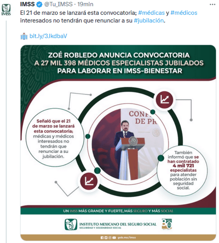 Una nueva oportunidad para trabajar en el Instituto Mexicano del Seguro Social (IMSS) para médicas y médicos especialistas está a punto de abrirse y lo mejor es que para participar en la convocatoria, los y la interesadas no tendrán que renunciar a su jubilación.Así lo dijo Zoé Robledo, director general del IMSS, quien anunció una convocatoria dirigida a 27 mil 398 médicas y médicos especialistas jubilados del Seguro Social, a fin de sumar su sabiduría y experiencia al Órgano Público Descentralizado (OPD) IMSS-Bienestar en hospitales que antes eran de la Secretaría de Salud y que, en muchos casos, no cuentan con especialistas.Durante la conferencia de prensa "mañanera" del Presidente Andrés Manuel López Obrador de este martes, en Palacio Nacional, Zoé Robledo detalló que 287 de las y los jubilados son menores de 55 años; 9 mil 659 tienen entre 56 y 65 años; 13 mil entre 66 y 75 años, y 3 mil 800 tiene más de 76 años.Resaltó que estos médicos tendrán la oferta de incorporarse "toda vez que el nuevo OPD IMSS-Bienestar forma parte del apartado B del artículo 123 de la Constitución, esto significa que van a poder tener al mismo tiempo su jubilación, sin necesidad de renunciar a ella o ponerla en suspensión, y tomar alguna de las bases para la consulta externa, cirugía e incluso para cargos normativos en la dirección de hospitales o unidades de primer nivel".Indicó que la convocatoria inicia el 21 de marzo y que los detalles serán publicados en la página medicosespecialistas.gob.mxPor otra parte, Zoé Robledo informó que para atender a la población a través del OPD IMSS-Bienestar, institución de la Cuarta Transformación para la atención médica de las personas que no tienen seguridad social, se han reclutado cuatro mil 721 médicos especialistas.El titular del Seguro Social apuntó, se han llevado a cabo diversas estrategias para captar a este personal: mil 232 fueron contratados en diversas convocatorias lanzadas del 24 de mayo al 20 de agosto de 2022; 610 especialistas vía el convenio con Servicios Médicos Cubanos, "número que se podrá ampliar casi al doble con 600 médicos y médicas más".Además, 188 reclutados por convocatorias internacionales que comenzarán a laborar en abril; residentes de último año en especialidades troncales distribuidos en 232 hospitales de IMSS-Bienestar, así como 634 especialistas que se incorporaron en la Jornada de Reclutamiento que se llevó a cabo la semana pasada.El director general del IMSS destacó que en las entidades que están en los procesos de federalización de los servicios de salud mediante los convenios con IMSS-Bienestar "verán incrementado de manera importante el número de especialistas, desde Michoacán hasta el estado de Morelos".Dijo que con respecto a las plazas que se ofertan para médicos en formación de especialistas en el Seguro Social a través del Examen Nacional de Residencias Médicas (ENARM), pasó de cuatro mil 637 en 2019 a 9 mil 040 en 2023; además, antes egresaban al año tres mil 960 especialistas y este año fueron cinco mil 600.Enfatizó que uno de los elementos más importantes de este proceso fue la incorporación de la especialidad de Medicina Familiar, que por años ha sido la columna vertebral del modelo preventivo del Seguro Social a los servicios de IMSS-Bienestar; "ahora lo que estamos buscando es que en el Primer Nivel de Atención haya médicos familiares, que lo mismo atienden a niños, adultos y adultos mayores, tienen una especialidad que les permite estar a lo largo de todo el ciclo vital donde se promueven estilos de vida saludables, y medidas para prevenir enfermedades crónico degenerativas".OA