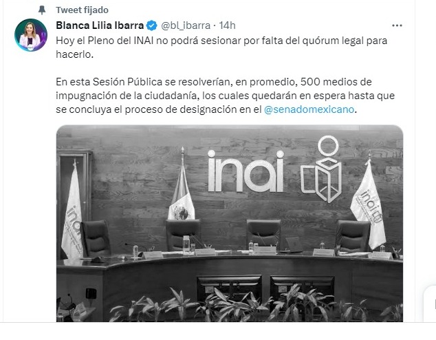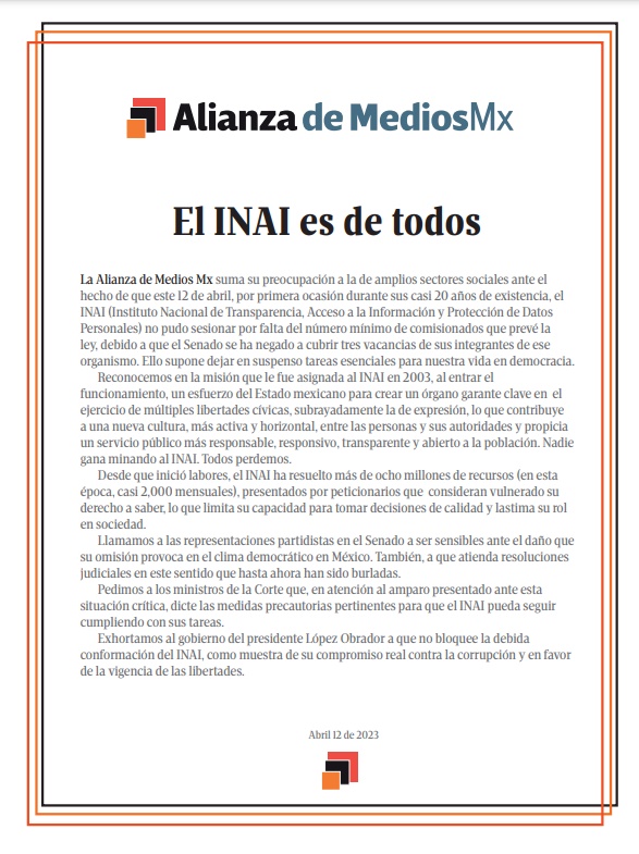 Luego de que no se cubrieron las tres vacantes en el Instituto Nacional de Transparencia, Acceso a la Información y Protección de Datos Personales (INAI), la Alianza de Medios Mx hizo un llamado a partidos del Senado y a ministros de la Suprema Corte de Justicia de la Nación (SCJN), para que dicten las medidas necesarias y que dicho órgano continúe en funciones.“Pedimos a los ministros de la Corte que, en atención al amparo presentado ante esta situación crítica, dicte las medidas precautorias pertinentes para que el Inai pueda seguir cumpliendo con sus tareas”, se lee en un comunicado.La Alianza de Medios pide a las representaciones partidistas en el Senado que sean sensibles ante el daño que su omisión provoca en el clima democrático en México.El INAI ha resuelto más de ocho millones de recursos, desde que inició labores en el 2003, describen en su texto.Otro punto que destacan en el comunicado es que durante el tiempo que dicho órgano ha estado activo, es decir, más de 20 años; ésta es la primera vez que no ha podido asistir a una sesión por falta del número mínimo de comisionados que prevé la ley.Al respecto, la comisionada presidenta del Instituto, Blanca Lilia Ibarra Cadena, escribió en un tuit que el INAI no pudo sesionar por falta de quórum.“Hoy el Pleno del INAI no podrá sesionar por falta del quórum legal para hacerlo. En esta Sesión Pública se resolverían, en promedio, 500 medios de impugnación de la ciudadanía, los cuales quedarán en espera hasta que se concluya el proceso de designación en el Senado mexicano”, publicó.