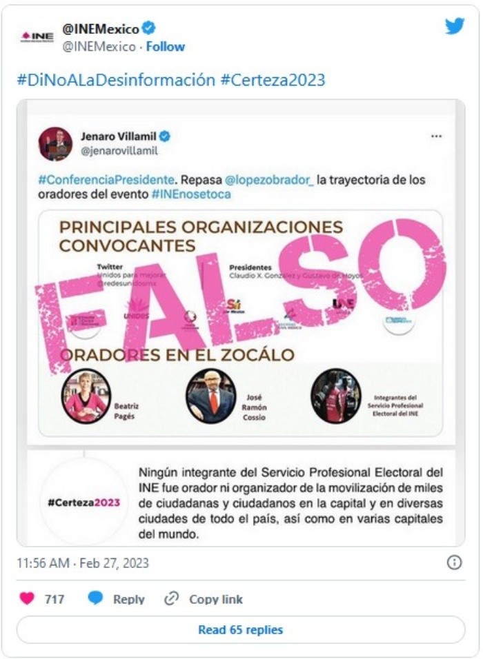 El Instituto Nacional Electoral (INE) negó que algún integrante del Servicio Profesional Electoral del INE haya sido orador u organizador de la movilización de este domingo en defensa del instituto.En un post, el INE calificó como falso un tuit del periodista y funcionario Jenaro Villamil retomado de la conferencia mañanera del Presidente López Obrador, donde en una lámina titulada "Principales Organizaciones Convocantes" coloca a integrantes del Servicio Profesional Electoral del INE."Ningún integrante del Servicio Profesional Electoral del INE fue orador ni organizador de la movilización de miles de ciudadanas y ciudadanos en la capital y en diversas ciudades de todo el país, así como en varias capitales del Mundo", aseguró el organismo en un comunicado.JM