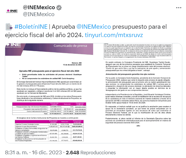 El Instituto Nacional Electoral (INE) de México redujo 558.9 millones de pesos el gasto programado para organizar las elecciones presidenciales, del Congreso y locales de junio de 2024.En un comunicado difundido este sábado, el organismo autónomo electoral mexicano indicó que su Consejo General aprobó por unanimidad la reducción de 552.6 millones de pesos para organizar el proceso de elección para elegir a representante de la presidencia de México.Con esto, el gasto total estimado para "organizar proceso electoral federal", que también incluye la elección de 628 legisladores del Congreso mexicano, pasó de 9 mil 355.4 millones de pesos a 8 mil 802.8 millones de pesos.Para la organización de los procesos electorales locales, el INE redujo de 81.8 millones de pesos a 75.5 millones de pesos.Esto implicó el recorte presupuestal de 6.3 millones de pesos para la ordenación de los comicios para la elección de gubernaturas, entre ellas la Ciudad de México, así como de congresos locales, ayuntamientos, entre 19 mil cargos públicos.En ambos casos, el INE aseguró que los ajustes en su gasto no tienen impacto en la organización de los procesos electorales 2024.Asimismo, el INE informó que contará con un presupuesto de 22 mil 322.9 millones de pesos para su ejercicio fiscal de 2024.El organismo autónomo precisó que, entre estos recursos, no se estimaron los necesarios para el financiamiento de los partidos políticos con registro en México, ya que, dijo, fue aprobado por separado y refleja el recorte de 5 mil 003.2 millones de pesos aprobado con anterioridad por la Cámara de Diputados.La consejera del INE, Carla Humphrey, presidente de la Comisión Temporal de Presupuesto 2024, indicó que el gasto recién aprobado garantiza tres ejes rectores: no comprometer los estándares de calidad INE y certeza para la preparación y desarrollo del proceso electoral.Así como la no afectación de derechos laborales y presentar la información con el mayor detalle posible en términos de la desagregación del gasto en sus componentes básicos.*Mantente al día con las noticias, únete a nuestro canal de WhatsAppOF