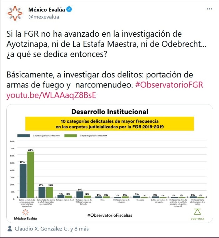 La Fiscalía General de la República (FGR) no ha conseguido dar justicia en el 95.1 % de los casos, que quedan impunes, reveló este miércoles un informe de la asociación México Evalúa."Esto implica que sólo el 4.9 % de los casos conocidos en el ámbito federal recibieron alguna respuesta efectiva, ya sea en términos de judicialización con una sentencia, o bien de una salida alterna o anticipada", detalló la investigación.La asociación presentó el reporte "De procuradurías a fiscalías: Observatorio de la transición 2020" en el que analiza la eficacia de la FGR tras su creación con la Ley Orgánica de la Fiscalía de 2018, que le otorgó autonomía legal frente al Gobierno.La investigación encontró que el 39 % de las resoluciones de la FGR en 2019 se fueron a archivo temporal, 9 % tuvieron "resoluciones por incompetencia" y en 4 % el Ministerio Público se "abstuvo de investigar".Además, el reporte sólo encontró 0.7 % de acuerdos reparatorios en las resoluciones, pese a que la reparación del daño ha sido prioridad del Presidente Andrés Manuel López Obrador (AMLO).El informe también detectó una disminución de 8 % en el personal de la FGR, al pasar de 22 mil 825 trabajadores en 2018 a 20 mil 904 en 2019.El reporte afirmó que la Fiscalía aún mantiene "estructuras burocráticas rígidas" de su época como Procuraduría."Una consecuencia de esta forma de organización es que las competencias entre las diferentes estructuras se traslapan y suelen existir conflictos de competencia en detrimento de las víctimas", advirtió.La pesquisa se difunde en un contexto en el que el Congreso aprobó este 22 de abril la nueva Ley de la Fiscalía General de la República (FGR), criticada porque disminuye su responsabilidad de búsqueda de personas desaparecidas e ignora las exigencias de las asociaciones ciudadanas de víctimas.JM