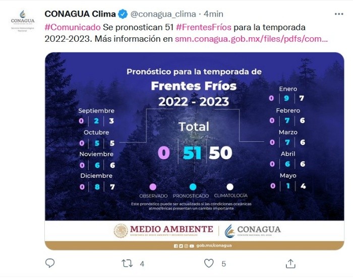 México prevé que ingresen al país 51 frentes fríos en la temporada 2022-2023, que inicia en septiembre y concluye en mayo, de acuerdo con los pronósticos del Servicio Meteorológico Nacional (SMN).Además, el SMN indicó que en diciembre de 2022 y enero de 2023 se registrará la mayor cantidad de sistemas frontales de la temporada.En una conferencia de prensa, la coordinadora del SMN, Alejandra Méndez Girón, adelantó que para septiembre de 2022 "se pronostica el ingreso de dos frentes fríos, para octubre cinco, para noviembre seis y para diciembre ocho".En tanto, en enero de 2023, "se estima el arribo de nueve sistemas frontales, en febrero y marzo siete, en cada mes, en abril seis y en mayo uno"."En la pasada temporada invernal se registraron 48 frentes fríos, y para la temporada 2022-2023 se pronostica el arribo de 51 sistemas frontales; los frentes fríos y masas de aire frío provocan descenso de temperatura y heladas", expuso Méndez Girón.La titular del SMN detalló que, "climatológicamente, los estados con mayores descensos de temperatura son Chihuahua, Ciudad de México, Durango, Estado de México, Puebla, Tlaxcala y Zacatecas".Mientras que para el centro del país se prevé que las temperaturas mínimas oscilen entre dos y ocho grados Celsius.Recordó que, durante este período, "las masas de aire frío provenientes de Canadá y Estados Unidos se desplazan a México y provocan descenso de temperatura y heladas en el norte y el centro del país", mientras que en el litoral del Golfo de México ocasionan intensos vientos del norte y oleaje elevado, lo que se conoce como norte (vientos helados).Explicó que, cuando las masas de aire avanzan hasta el Istmo de Tehuantepec, "generan viento del norte muy fuerte, que incluso supera los 100 kilómetros por hora (km/h), situación que se puede extender hasta el Golfo de Tehuantepec, donde provoca oleaje elevado", mientras que en la Península de Yucatán disminuyen las temperaturas.La coordinadora del SMN subrayó que, así como se hace durante la temporada de lluvias y ciclones tropicales, durante la época de sistemas invernales se mantiene estrecha colaboración con la Coordinación Nacional de Protección Civil y las secretarías de la Defensa Nacional y Marina.Así como instancias municipales, estatales y federales, con el fin de que se implementen oportunamente los protocolos establecidos para proteger a la población y su patrimonio.JM