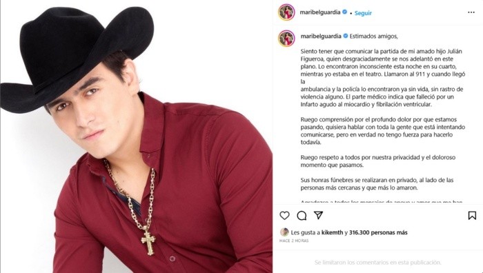El expresidente de México, Felipe Calderón Hinojosa, expresó sus condolencias a la actriz y cantante Maribel Guardia por el fallecimiento de su hijo, Julián Figueroa.La noche de este lunes se informó sobre la muerte del también cantante y actor, quien además es hijo del compositor Joan Sebastian, fallecido hace ocho años."Mis condolencias a Maribel Guardia por la sensible pérdida de su hijo. Descanse en paz", escribió el expresidente de México en redes sociales.Maribel Guardia explicó a través de una publicación en Instagram que Julián fue hallado sin vida en su cuarto."Lo encontraron inconsciente esta noche en su cuarto, mientras yo estaba en el teatro. Llamaron al 911 y cuando llegó la ambulancia y la policía lo encontraron ya sin vida, sin rastro de violencia alguno. El parte médico indica que falleció por un Infarto agudo al miocardio y fibrilación ventricular", detalló.JM