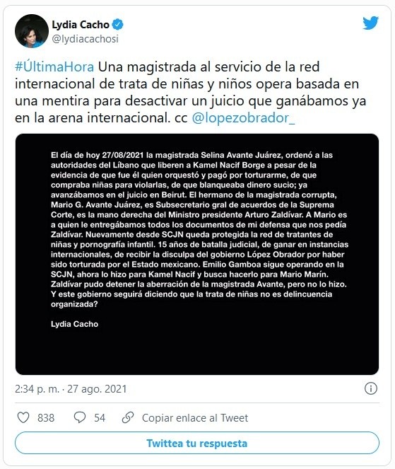 Lydia Cacho denunció este viernes a través de sus redes sociales la liberación del empresario Kamel Nacif Borge por órdenes de la magistrada Selina Avante Juárez.Además, expuso que desde la Suprema Corte de Justicia de la Nación "queda protegida la red de tratantes de niñas y pornografía infantil", puesto que era al hermano de la magistrada a quien se le entregaban los documentos de su defensa solicitados por el ministro presidente Arturo Zaldívar."La magistrada Selina Avante Juárez ordenó a las autoridades del Líbano que liberen a Kamel Nacif Borge a pesar de la evidencia de que fue él quien orquestó y pagó por torturarme, de que compraba niñas para violarlas, de que blanqueaba dinero sucio; ya avanzábamos en el juicio en Beirut", fue parte de un escrito que difundió la escritora en Twitter.Si te interesó esta noticia y quieres saber más, entonces descarga y descubre INFORMAPlus, la aplicación digital de EL INFORMADOR, en donde tenemos contenidos exclusivos, seleccionados por nuestros editores, para darles una experiencia más completa a los lectores. Si eres suscriptor de EL INFORMADOR tu acceso está incluido, solicítalo al 33 3678-7777Descarga la aplicación y pruébala GRATIS por treinta días.Para iOS: https://apple.co/35jaVgbPara Android: https://bit.ly/3gwVSEVJM