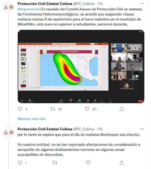 Ante las lluvias causadas por el huracán "Kay", la Unidad Estatal de Protección Civil de Colima informó que se determinó suspender clases este martes 6 de septiembre para el turno matutino en el municipio de Minatitlán, y evitar exponer a estudiantes, personal docente, administrativo y de apoyo a la educación que se trasladan por la carretera Villa de Álvarez-Minatitlán a los diferentes centros educativos.El huracán "Kay" de categoría 1 en la escala Saffir-Simpson, actualmente se encuentra a 510 kilómetros al sureste de Manzanillo, Colima, desplazándose a 7 kilómetros por hora hacia el oeste, previendo una trayectoria que continuará alejándose; por lo tanto, se espera que en las siguientes 24 horas disminuyan sus efectos.La Unidad Estatal de Protección Civil indicó que hasta el momento en Colima no se han reportado afectaciones de consideración, a excepción de algunos deslizamientos menores en algunas zonas susceptibles de derrumbes.El Gobierno del Estado hizo un llamado a toda la población a mantenerse atenta ante cualquier situación y procurar la información verídica a través de fuentes oficiales.GC