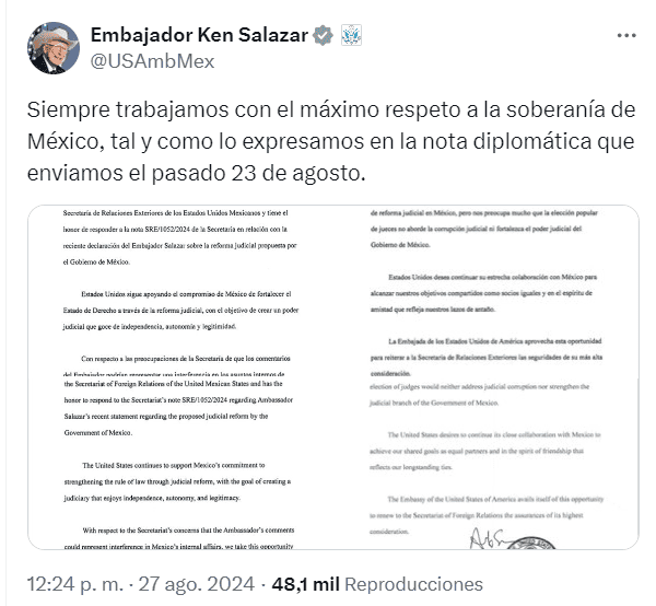 Este martes, el embajador de Estados Unidos en México, Ken Salazar, respondió al Presidente Andrés Manuel López Obrador, luego de que este declaró en la mañanera de hoy que habrá una "pausa" en la relación con las embajadas de su país y la de Canadá, luego de que criticaran la reforma al Poder Judicial."La relación continúa, pero ojalá y haya de parte de ellos una ratificación de que van a ser respetuosos de la independencia de México, de la soberanía de nuestro país, pero mientras no haya eso y sigan con esa política, hay pausa", advirtió López Obrador durante su tradicional conferencia matutina ante los medios.En sus redes sociales, Ken Salazar dijo que "Siempre trabajamos con el máximo respeto a la soberanía de México, tal y como lo expresamos en la nota diplomática que enviamos el pasado 23 de agosto", en referencia a que ese día alertó por riesgos a la democracia y la relación comercial con Estados Unidos derivado de la elección de jueces, además de advertir de que la elección popular facilitaría la intromisión de los cárteles en la justicia.En el comunicado compartido por Salazar, se dice que "Con respecto a las preocupaciones de la Secretaría (SRE) de que los comentarios del Embajador podrían representar una interferencia en los asuntos internos de México, aprovechamos esta oportunidad para afirmar nuestro máximo respeto por la soberanía de México. Al mismo tiempo, mientras trabajamos de manera conjunta como socios para hacer realidad la integración económica de América del Norte y abordar los desafíos de seguridad compartidos que afectan directamente a nuestros dos pueblos, es del interés de los Estados Unidos identificar los acontecimientos que limitarían innecesariamente nuestra capacidad para alcanzar estos objetivos juntos".La embajada de EU respaldó los dichos de Ken Salazar al expresar que apoyan el "concepto de reforma judicial en México, pero nos preocupa mucho que la elección popular de jueces no aborde la corrupción judicial ni fortalezca el Poder Judicial del Gobierno de México".Y al final, el comunicado expresa que EU desea continuar su colaboración con nuestro país "como socios iguales y en el espíritu de amistad nuestros lazos de antaño".*Mantente al día con las noticias, únete a nuestro canal de WhatsAppOF