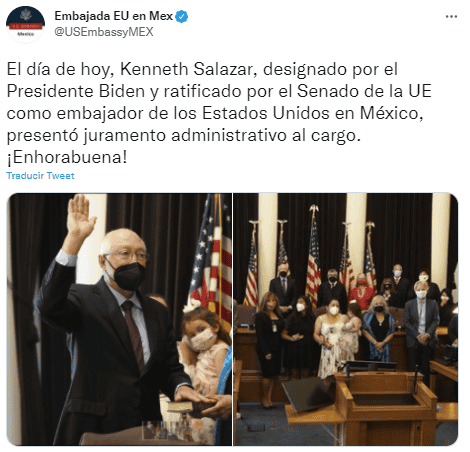 Este jueves, el demócrata Ken Salazar rindió protesta como el primer embajador de Estados Unidos en México durante la administración de Joe Biden. En un mensaje en sus redes sociales, la diplomacia estadounidense anunció que el originario de Colorado rindió protesta para tomar el cargo a penas a dos semanas de ser ratificado por el Senado."El día de hoy, Kenneth Salazar, designado por el Presidente Biden y ratificado por el Senado de E.U. como embajador de los Estados Unidos en México, presentó juramento administrativo al cargo. ¡Enhorabuena!", se lee en la publicación de la misión estadounidense.Asimismo, informó que el ahora embajador sostuvo la primera llamada con su similar mexicano, Esteban Moctezuma, luego de presentar su juramento.Si te interesó esta noticia y quieres saber más, entonces descarga y descubre INFORMAPlus, la aplicación digital de EL INFORMADOR, en donde tenemos contenidos exclusivos, seleccionados por nuestros editores, para darles una experiencia más completa a los lectores. Si eres suscriptor de EL INFORMADOR tu acceso está incluido, solicítalo al 33 3678-7777Descarga la aplicación y pruébala GRATIS por treinta días.Para iOS: https://apple.co/35jaVgbPara Android: https://bit.ly/3gwVSEVAA
