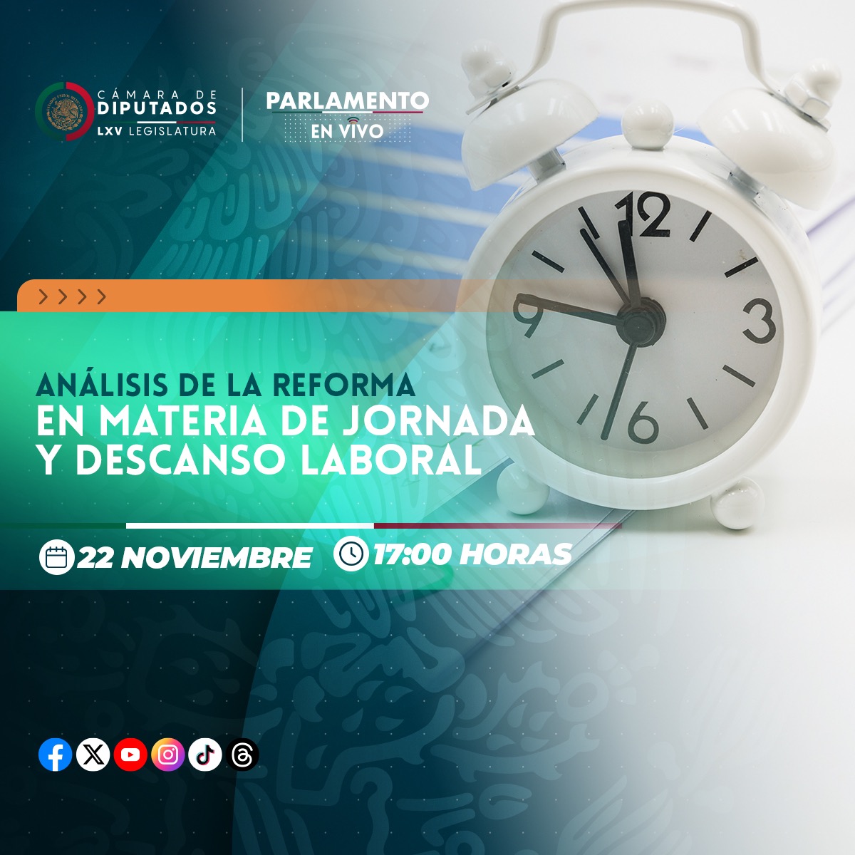 En esta edición del Parlamento en Vivo, los diputados y diputadas debatirán la reforma que disminuye de 48 a 40 horas semanales la Jornada Laboral. Este análisis de la reforma en materia de jornada y descanso laboral, se llevará a cabo este miércoles 22 de noviembre a las 17:00 horas.Esta actividad será transmitida a través de las cuentas de YouTube y Facebook de la Cámara de Diputados. *Mantente al día con las noticias, únete a nuestro canal de WhatsApp aquí: https://whatsapp.com/channel/0029VaAf9Pu9hXF1EJ561i03MV