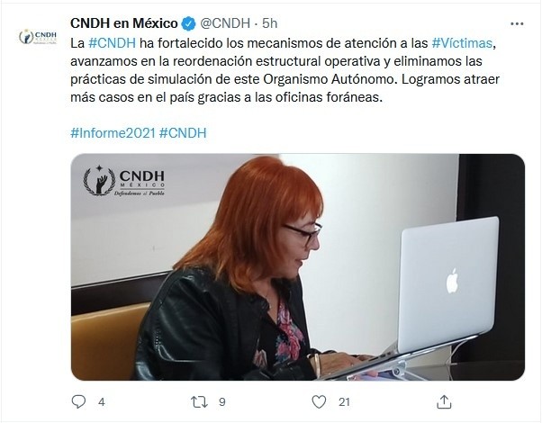"A pesar de la brutal campaña mediática que enfrentamos desde hace dos años", el esfuerzo por transformar a la Comisión Nacional de los Derechos Humanos (CNDH) no ha sido estéril, afirmó la titular del organismo, Rosario Piedra Ibarra."Al pueblo no se le engaña, todas nuestras acciones han sido orientadas en beneficio de las víctimas y se expondrán siempre con transparencia", dijo al presentar este martes su informe anual ante la Cámara de Diputados.Piedra Ibarra aseguró que hoy no se emiten recomendaciones a modo, o acordadas con la autoridad, y que pese a la pandemia de COVID-19, la Comisión no ha cesado ningún día en brindar atención a las víctimas y a quienes están en riesgo de serlo."Hoy no se emiten recomendaciones a modo, o acordadas con la autoridad, con ellas, con todas se procura el diálogo, la comunicación, pero que quede claro que en esta nueva etapa la CNDH no tiene más compromiso que con el pueblo de México y con los derechos humanos".Dijo que al inicio de su gestión heredó 508 recomendaciones sin cumplimiento. Una, la más antigua, fue emitida en 2011, la de la Guerra Sucia; seis en 2009 y 35 en 2013, 75 en 2017, 86 en 2018 y 94 en 2019, indicó."Están pendientes los hechos de San Fernando, de Nochixtlán, de Tlatlaya y la del caso Iguala y se han estado concluyendo expedientes de queja que tenían al menos cinco años sin atención alguna".Además de eso, comentó, en 2021 emitió un total de 155 instrumentos recomendatorios, 53 más que el año pasado, y el más alto número histórico de recomendaciones emitidas por la CNDH desde que se integró este organismo constitucional autónomo.JM