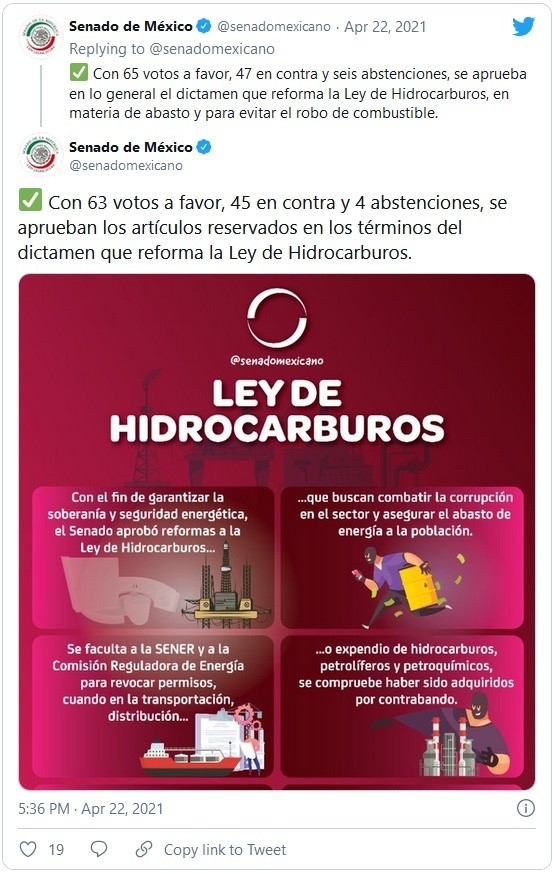 Después de más de siete horas de discusión, y luego de haber desestimado una por una las reservas que presentaron los partidos de oposición, el Senado de la República aprobó en lo general y en lo particular las reformas a la Ley de Hidrocarburos, que buscan echar atrás, en los hechos, la reforma energética de 2013.Entre aplausos, gritos de ¡Viva México! y rechiflas que sonaron a través de las pantallas de computadoras y teléfonos portátiles, los legisladores de Morena y el Partido del Trabajo (PT) celebraron la aprobación del nuevo paquete de reformas que, entre otras, castiga el "huachicoleo" al retirar la autorización de venta de combustible a las gasolineras que compren combustible contrabandeado, y revocar permisos a quienes vendan litros incompletos de gasolina.Además, faculta a la Secretaría de Energía y a la Comisión Reguladora de Energía (CRE) de intervenir u ocupar instalaciones de centros donde se almacene o se comercialicen los combustibles; y de asegurar que puedan suspender los permisos expedidos cuando se prevé un peligro inminente para la seguridad nacional, la seguridad energética o para la economía nacional.También se plantea la obligación de los permisionarios de demostrar, previo al otorgamiento de permisos, que cuentan con la capacidad de almacenamiento mínimo de cinco días.JM