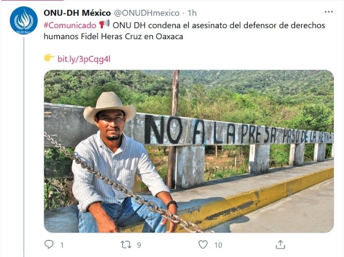 La oficina en México del Alto Comisionado de las Naciones Unidas para los Derechos Humanos (ONU-DH) condenó este miércoles el asesinato del defensor de derechos humanos y del territorio Fidel Heras Cruz, ocurrido el pasado sábado en Oaxaca."La percepción de que es posible asesinarlas (a personas defensoras) y así debilitar el activismo en defensa de los derechos humanos, como la defensa del territorio y del medio ambiente, se ve fortalecida con cada asesinato que permanece en la impunidad", señaló en un comunicado el representante de la ONU-DH en México, Guillermo Fernández-Maldonado.El defensor fue asesinado a balazos el sábado 23 de enero en el municipio de Jamiltepec, dos días después de haber recibido un mensaje anónimo con amenazas de muerte."Es importante que las investigaciones consideren dichas amenazas, así como la posible vinculación de su asesinato con su labor de defensa de la tierra y el territorio", indicó el organismo.En este sentido,la ONU-DH insistió en la necesidad de que se lleve a cabo una investigación efectiva de los hechos "que logre llevar ante la justicia tanto a los autores directos del asesinato como a sus autores intelectuales".Heras Cruz era presidente del Comisariado Ejidal de Paso de la Reyna, en el municipio de Santiago Jamiltepec (Oaxaca), miembro activo del Consejo de Pueblos Unidos por la Defensa del Río Verde y en los últimos años había participado activamente en acciones para controlar la extracción masiva de material pétreo en la zona del Río Verde.JM