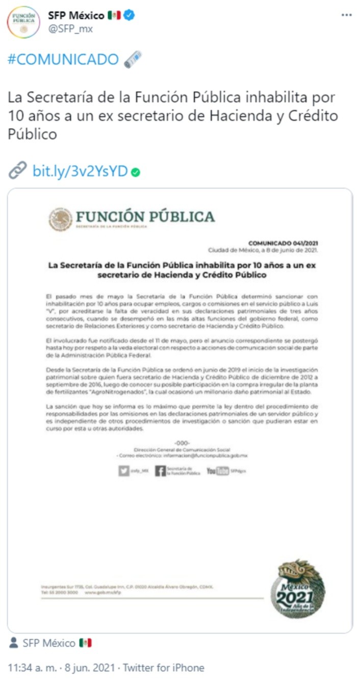 La Secretaría de la Función Pública (SFP) informó que en mayo pasado se determinó sancionar con la inhabilitación por 10 años, para ocupar empleos, cargos o comisiones en el servicio público, a Luis Videgaray, ex secretario de Hacienda y Relaciones Exteriores en el sexenio de Enrique Peña Nieto.La SFP refirió en un comunicado que se acreditó "la falta de veracidad en sus declaraciones patrimoniales de tres años consecutivos, cuando se desempeñó en las más altas funciones del gobierno federal, como secretario de Relaciones Exteriores y como secretario de Hacienda y Crédito Público".Puntualizó que el involucrado fue notificado desde el 11 de mayo, pero el anuncio correspondiente se postergó hasta hoy "por respeto a la veda electoral"."Desde la Secretaría de la Función Pública se ordenó en junio de 2019 el inicio de la investigación patrimonial sobre quien fuera secretario de Hacienda y Crédito Público de diciembre de 2012 a septiembre de 2016, luego de conocer su posible participación en la compra irregular de la planta de fertilizantes 'AgroNitrogenados', la cual ocasionó un millonario daño patrimonial al Estado"."La sanción que hoy se informa es lo máximo que permite la ley dentro del procedimiento de responsabilidades por las omisiones en las declaraciones patrimoniales de un servidor público y es independiente de otros procedimientos de investigación o sanción que pudieran estar en curso por esta u otras autoridades", señaló.OF