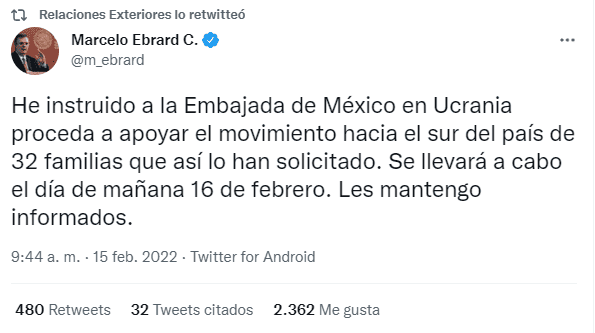 La Secretaría de Relaciones Exteriores (SRE) informó que moverá a 32 familias mexicanas que viven en Ucrania hacia el sur de ese país ante la crisis desatada con Rusia."He instruido a la Embajada de México en Ucrania para que proceda a apoyar el movimiento hacia el sur del país de 32 familias que así lo han solicitado. Se llevará a cabo el día de mañana 16 de febrero. Les mantengo informados", informó brevemente Marcelo Ebrard, en Twitter.Rusia comenzó a retirar este 15 de febrero algunas unidades militares próximas a la frontera con Ucrania, mientras la Duma, la cámara baja parlamentaria, pidió al presidente Vladímir Putin que reconozca la independencia de las autoproclamadas repúblicas populares de Donetsk y Lugansk, en el este de Ucrania.Ello mientras el propio Putin afirmaba que Rusia no quiere una guerra en Europa: "¿Si queremos guerra? Claro que no", dijo al comentar la tensión actual en la frontera con Ucrania en una rueda de prensa junto al canciller alemán, Olaf Scholz.Putin agregó que su país ha hecho propuestas para unas negociaciones acerca de la seguridad europea, cuyo resultado debe ser un acuerdo que responda a los intereses de todos.Subrayó que las futuras negociaciones deben tener en cuenta las principales preocupaciones rusas en materia de seguridad, que incluyen la no ampliación de la OTAN hacia el este y el rechazo al despliegue de sistemas de ataque cerca de las fronteras rusas.A finales de enero, la Armada rusa anunció ejercicios a gran escala en todo el territorio nacional con la participación de más de 140 buques y casi 10 mil soldados y días después el Gobierno de Estados Unidos prometió una respuesta severa ante cualquier incursión rusa en Ucrania.La Federación de Rusia se anexionó la península ucraniana de Crimea en 2014.GC