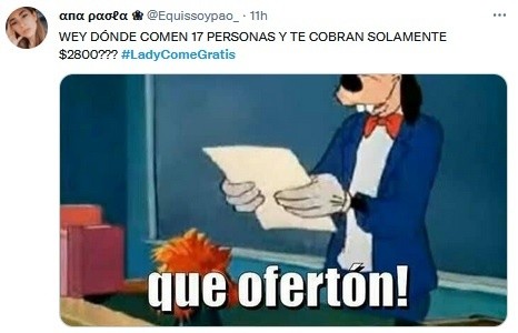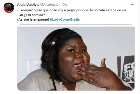 Una mujer que acudió a comer con 17 personas a un restaurante en Gómez Palacio, Durango, se negó a pagar y la apodaron en redes #LadyComeGratis.Un video de hizo viral en donde se ve a la señora discutir con el personal del lugar. La mujer señala varias veces que no pagará la cuenta de dos mil 800 pesos porque la comida estaba cruda.La discusión comenzó cuando terminaron de comer. La mujer y sus invitados se fueron del restaurante sin pagar comida ni bebidas.El material fue grabado el pasado 10 de mayo en el restaurante "Los Aguachiles" del municipio."Indignante que esta señora con una cuenta de mas de 2,800 con 17 personas en su mesa y para no pagar salió con que un platillo de ella estaba crudo yéndose sin pagar bebidas y comida , siendo grosera con el personal cuando ellos en ningún momento la trataron mal", se lee en una publicación en Facebook.En Twitter usuarios compartieron memes y se mofaron de la mujer "que solo fue a comer gratis".