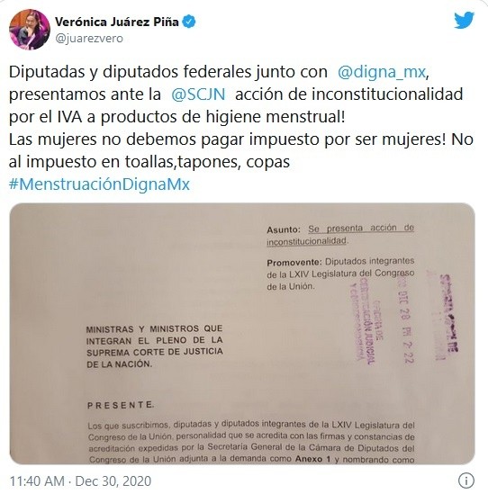 Este lunes, un grupo de 169 legisladores de distintas fuerzas políticas, acompañados de distintos colectivos de la sociedad civil, presentaron una acción de inconstitucionalidad ante la Suprema Corte de Justicia de la Nación para que se elimine el Impuesto al Valor Agregado (IVA) a todos los productos de higiene menstrual.La diputada federal de Movimiento Ciudadano, Martha Tagle, informó de esta impugnación que se presentó y dijo que ahora le tocará a la Suprema Corte decidir sobre la "justicia menstrual y la equidad tributaria" para que se logre una política tributaria con enfoque de género.En un documento anexo, la organización "#MenstruaciónDignaMéxico" dio a conocer que respalda la acción de inconstitucionalidad que presentó el 34% de los diputados contra la tasa del IVA del 16% a productos de gestión menstrual.A través de su Twitter, dicha organización dijo que el acceso a toallas, tampones y copas es de vital importancia para los derechos de las niñas, adolescentes, mujeres y personas menstruantes."Gracias a esta acción, le tocará a la @scjn decidir sobre la justicia menstrual y la equidad tributaria para lograr una política tributaria con enfoque de género #MenstruaciónLibreDeImpuestos", posteó la organización.En la aprobación de la Ley de Ingresos, diversas bancadas, incluidas de Morena, presentaron una propuesta de modificación para que se no se gravaran estos productos; sin embargo, la mayoría legislativa lo impidió, por lo que en el 2021 se seguirán cobrando impuestos a toallas, tampones y copas sanitarias.En el documento presentado en la Gaceta Parlamentaria y expuesto por la diputada de MC, Martha Tagle, se describe como una propuesta que forma parte de una estrategia más amplia impulsada por el colectivo "#MenstruaciónDignaMéxico" para que la gestión menstrual se vea como un tema público que debe ser incorporado a las políticas públicas para crear condiciones estructurales que permitan a todas las mujeres, niñas, adolescentes y otras personas menstruantes en México, vivirla con dignidad.Y se divide en tres ejes de acción: 1) la gratuidad de los productos de gestión menstrual, 2) la eliminación del IVA a dichos productos, y 3) generar investigación y datos sobre la gestión menstrual en México.JM