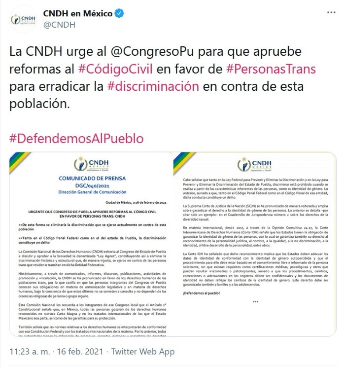 La Comisión Nacional de Derechos Humanos (CNDH) exhortó al Congreso de Puebla aprobar de manera urgente el código civil en favor de personas trans, a fin de proteger la integridad de dicho sector poblacional.El organismo conminó al Congreso poblano discutir y aprobar la denominada "Ley Agnes" y contribuir a eliminar la discriminación histórica y estructural que, de manera injusta, se ejerce en contra de las personas trans que residen o transitan en el estado.La CNDH recordó a los congresistas de Puebla que están obligados en materia de armonización legislativa y en materia de derechos humanos a legislar en temas trans, bajo la conciencia de que estos últimos no se someten a consulta y no dependen de las creencias religiosas de persona o grupo alguno.También les subrayó al Congreso local que el artículo 1° Constitucional señala que en México todas las personas gozarán de los derechos humanos reconocidos en nuestra Carta Magna y en los tratados internacionales de los que el Estado mexicano sea parte, así como de las garantías para su protección.Igualmente, las leyes mexicanas señalan que las normas relativas a los derechos humanos se interpretarán de conformidad con esa Constitución federal y con los tratados internacionales de la materia.Por lo anterior, la CNDH dijo que todas las autoridades tienen la obligación de promover, respetar, proteger y garantizar los derechos humanos de conformidad con los principios de universalidad, interdependencia, indivisibilidad y progresividad.Otras leyes jurídicas que están pasando por alto los legisladores de Puebla son el Cuadernillo de Jurisprudencia número 2 sobre los derechos de la diversidad sexual y la Opinión Consultiva 24-17 de la Corte Interamericana de Derechos Humanos.JM