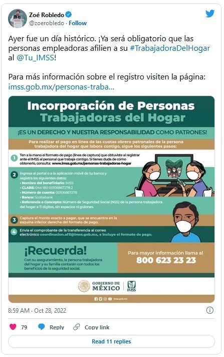 El Instituto Mexicano de Seguro Social (IMSS) celebró la reforma a la Ley del Seguro Social, porque permitirá un proceso de afiliación más flexible para 2.3 millones de personas trabajadoras del hogar que hay en el país.El director general, Zoé Robledo, afirmó que es "un triunfo sin precedentes" en México.Las modificaciones a la ley harán más accesible, simplificada y obligatoria la afiliación para todas las empleadoras y empleadores.También establece que las personas trabajadoras del hogar tendrán acceso a los cinco seguros que la ley contempla: Enfermedades y Maternidad; Riesgos de Trabajo; Invalidez y Vida; Retiro, Cesantía en Edad Avanzada y Vejez; y Guarderías y Prestaciones Sociales."Con esta aprobación se concluye el proceso legislativo por parte de Congreso de la Unión y se enviará al presidente de la República para su publicación. La reforma reconoce el trabajo del hogar y se dignifica una actividad productiva que había estado siempre poco valorada", aseguró el titular del IMSS.Los trabajadores del hogar contarán con atención médica, farmacéutica y hospitalaria, pago de incapacidades por enfermedad o riesgos de trabajo, generar ahorro para su retiro o una pensión en caso de invalidez, para el asegurado y sus beneficiarios legales; así como el acceso a estancias infantiles y actividades de esparcimiento.La reforma aprobada por la Cámara de Diputados establece un plazo de seis meses para flexibilizar el trámite de afiliación. Éste podrá efectuarse de manera presencial en las 133 subdelegaciones o en la página del IMSS, donde se encuentra un micrositio con preguntas frecuentes, tutoriales, calculadora de cuotas y acceso directo al trámite.El director general del IMSS recordó que en 2019, por sentencia de la Suprema Corte de Justicia de la Nación (SCJN), se implementó la prueba piloto para las personas trabajadoras del hogar en México, con ello, el IMSS inició el aseguramiento.Afirmó que la clave de esta reforma es que las y los trabajadores del hogar cuenten con mecanismos para hacerle saber al IMSS si hay alguna negativa por parte de sus empleadores al aseguramiento. "No es un favor, es un ejercicio de derechos. Se parte de la confianza de la gente y las cosas se tienen que hacer bien".El Seguro Social cuenta con centrales telefónicas, la página de Internet donde se lleva a cabo el registro y también se trabaja para habilitar un espacio donde las trabajadoras del hogar podrán hacer denuncias o plantear negativas de aseguramiento.Para realizar el trámite por parte del empleador se necesita identificación oficial, CURP, comprobante de domicilio, correo electrónico y datos de contacto. Por parte del trabajador: identificación oficial, CURP, Número de Seguridad Social, comprobante de domicilio, datos de contacto. Indicar el tipo de contratación: por mes completo o por día de trabajo.En ambos casos el salario base de cotización será el monto que se le pague a la persona trabajadora del hogar, no pudiendo ser inferior al equivalente del salario mínimo de la Ciudad de México del periodo de que se trate (diario o mensual) ni superior al importe equivalente a 25 UMAS. Al ingresar la información, el sistema calculará el importe de las cuotas de seguridad social a cubrir y generará una línea de captura para el pago.El pago del aseguramiento deberá efectuarse a más tardar el día 20 de cada mes, posteriormente se da el alta de la persona en el IMSS y el aseguramiento inicia el primer día del mes inmediato posterior al del pago.Cuando la persona trabajadora del hogar acumule 20 días de trabajo en el periodo de un mes y el importe de su ingreso mensual sea igual o superior al salario mínimo de la Ciudad de México, se les otorgará el aseguramiento por el periodo completo.Una vez que inicia, la persona trabajadora del hogar podrá registrarse en la clínica que les corresponda y registrar también a sus beneficiarios: cónyuge, concubina o concubinario; hijos hasta los 16 años, extensivo a los 25 años si estudian o de manera indefinida si tienen alguna discapacidad; padres si dependen económicamente de la trabajadora del hogar y habitan en el mismo domicilio.Para recibir orientación sobre este esquema, pueden llamar al 800 623 23 23 o visitar el micrositio imss.gob.mx/personas-trabajadoras-hogar.JM