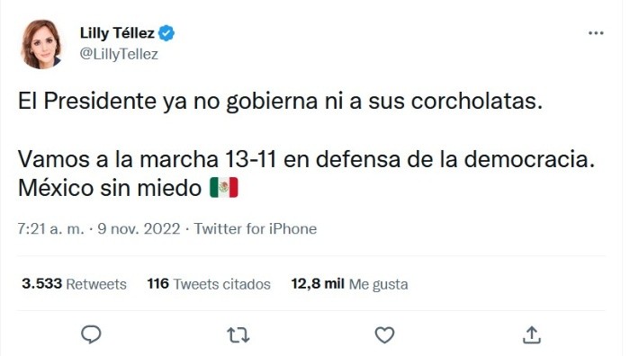 La senadora Lilly Téllez llamó a asistir a la marcha de este domingo 13 en defensa del INE y sentenció que el Presidente Andrés Manuel López Obrador "ya no gobierna ni a sus corcholatas"."El Presidente ya no gobierna ni a sus corcholatas. Vamos a la marcha 13-11 en defensa de la democracia. México sin miedo", escribió la senadora panista en su cuenta de Twitter.Este martes, tras las críticas de López Obrador a los asistentes a la marcha para defender al INE, convocada para este domingo 13 de noviembre, la senadora Lilly Téllez le mandó un mensaje."¿Por qué nos detesta a los católicos?", cuestionó la senadora de Acción Nacional."¿Por qué le molesta que vayamos a misa y a la marcha por la democracia?", agregó la legisladora de Sonora.Opositores hicieron un llamado a participar el próximo 13 de noviembre, el día del cumpleaños de López Obrador, en una marcha contra la reforma electoral para defender al INE."Debemos alzar la voz contra la tiranía. Después no habrá espacio para expresarnos. No faltes el 13 de nov., 10:30 en Ángel de la Independencia", convocó el empresario Claudio X. González.A los asistentes a la marcha "El INE no se toca" se les pidió asistir con una prenda rosa para llegar al Hemiciclo a Juárez.JM