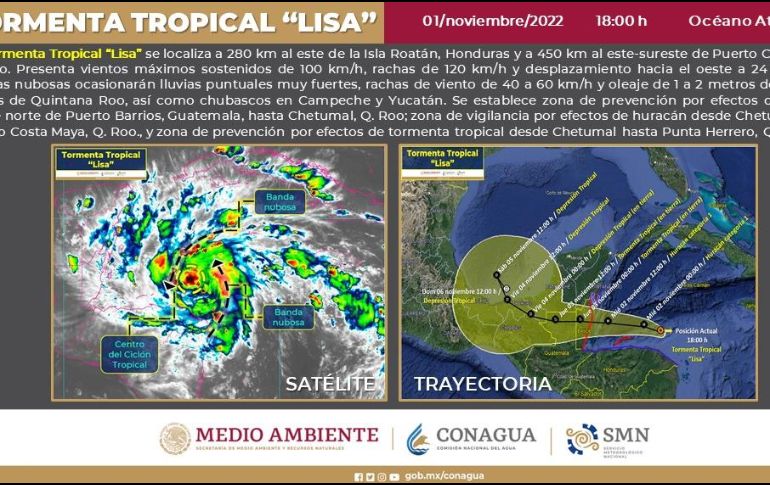 La Comisión Nacional del Agua (Conagua) pronosticó que debido a la tormenta tropical "Lisa" durante esta noche y madrugada del miércoles habrá condiciones para lluvias puntuales muy fuertes con rachas de viento de 40 a 60 km/h y oleaje de 1 a 2 metros de altura en la costa de Quintana Roo, además de chubascos en Campeche y Yucatán.Por otro lado, se informó que los canales de baja presión, uno extendido desde el occidente del Golfo de México hasta el sureste del país y otro en el centro de México, aunado a la entrada de humedad de ambos océanos, ocasionarán lluvias puntuales fuertes en zonas de Tamaulipas y Chiapas.También se esperan lluvias con intervalos de chubascos en zonas de Nuevo León, San Luis Potosí, Querétaro, Hidalgo, Veracruz, Puebla, Tlaxcala, Estado de México, Ciudad de México, Morelos, Michoacán y Guerrero.Las lluvias mencionadas estarán acompañadas de descargas eléctricas y posible caída de granizo.Se detalló que para mañana “Lisa” se podría intensificar a huracán categoría 1 en la escala Saffir- Simpson y se pronostica que su centro ingrese en horas de la noche a Belice, su amplia circulación provocará a lo largo del día condiciones para lluvias de fuertes a muy fuertes en el sureste del país, incluida la Península de Yucatán, presentandose lluvias puntuales intensas con fuertes rachas de viento en zonas Campeche y Quintana Roo.A las 18:00 horas tiempo del centro de México, la tormenta tropical Lisa se localizó aproximadamente a 280 kilómetros (km) al este de la Isla Roatán, Honduras, y a 450 km al este-sureste de Puerto Costa Maya, Quintana Roo. Presentó vientos máximos sostenidos de 100 kilómetros por hora (km/h), rachas de 120 km/h y desplazamiento hacia el oeste a 24 km/h.