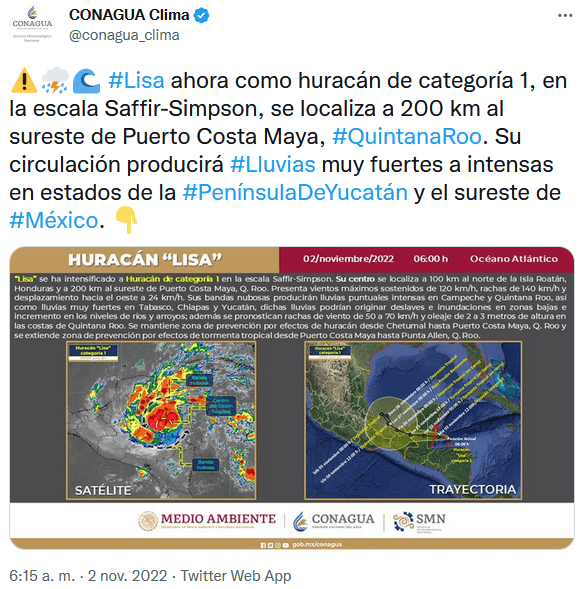 La tormenta tropical "Lisa" se convirtió en huracán categoría 1 a 100 kilómetros al norte de la Isla Roatán, Honduras y a 200 kilómetros al sureste de Puerto Costa Maya, Quintana Roo.El Servicio Meteorológico Nacional (SMN) informó que el fenómeno presenta vientos máximos sostenidos de 120 kilómetros por hora, rachas de 140 kilómetros por hora y desplazamiento hacia el oeste a 24 kilómetros por hora.Sus bandas nubosas producirán lluvias puntuales intensas en Campeche y Quintana Roo, así como lluvias muy fuertes en Tabasco, Chiapas y Yucatán, dichas lluvias podrían originar deslaves e inundaciones en zonas bajas e incremento en los niveles de ríos y arroyos; además se pronostican rachas de viento de 50 a 70 kilómetros por hora y oleaje de 2 a 3 metros de altura en las costas de Quintana Roo.Se mantiene zona de prevención por efectos de huracán desde Chetumal hasta Puerto Costa Maya, Quintana Roo y se extiende zona de prevención por efectos de tormenta tropical desde Puerto Costa Maya hasta Punta Allen, Quintana Roo.OA