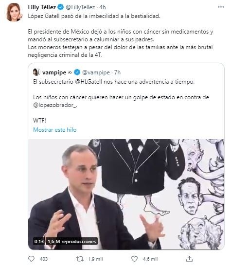 Hugo López-Gatell ligó la "narrativa" del desabasto de medicinas para niños con cáncer con un golpe de Estado, debido al comentario, la senadora Lilly Téllez refirió que el secretario de Prevención y Promoción de la Salud "pasó de la imbecilidad a la bestialidad".Por medio de redes sociales, la senadora de Acción Nacional acusó que el presidente Andrés Manuel López Obrador dejó a los niños con cáncer sin medicamentos y mandó al subsecretario López-Gatell a calumniar a sus padres.Al asistir a Chamuco TV para platicar con los moneros Hernández, Rapé y El Fisgón, el subsecretario de Prevención y Promoción de la Salud llamó a no caer en la "infomedia" ante la pandemia por Covid-19.López-Gatell declaró que dos elementos claves para generar una oleada de odio "son la desinformación y el pánico" y mencionó el caso del abasto de medicinas, que según él, han usado grupos de partidos políticos."Y entonces se agarraron de bandera algo que es socialmente muy sensible, que es la niñez y el cáncer, que irremediablemente es una enfermedad que está asociada con dolor humano y sufrimiento."Entonces crearon esta fórmula de los niños con cáncer que no tienen medicamentos. Es una mentira, si cualquiera de la ciudadanía quisiera tener una constatación rápida, se podría hacer esta pregunta: ¿Por qué si los niños de México no tienen medicamentos, los niños que padecen cáncer, por qué sólo vemos a 20 personas haciendo manifestaciones, cerrando el aeropuerto? Son las mismas 20 personas desde que empezó el sexenio", añadió López Gatell.También López-Gatell lanzó una "especie de alerta": "Este tipo de generación de narrativas de golpe, a veces se ha conectado en Latinoamérica, con golpe golpe, golpe de Estado, y esta idea de los niños con cáncer que no tienen medicamentos cada vez lo vemos más posicionado como parte de una campaña, más allá del país, de los grupos de derecha internacionales que están buscando crear esta ola de simpatía en la ciudadanía mexicana, ya con una visión casi golpista".Al respecto, la senadora Lilly Téllez acusó que los moneros "festejan a pesar del dolor de las familias ante la más brutal negligencia criminal de la 4T".Ante amparos presentados por médicos para ser vacunados contra Covid-19, Lilly Téllez expresó en mayo: "Lástima que no existe vacuna ni medicina que atenúe su imbecilidad y mezquindad".MB
