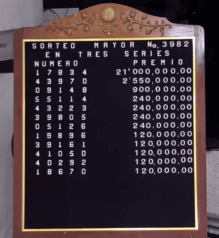 Cada martes es una nueva oportunidad para tentar a la suerte con el Sorteo Mayor de la Lotería Nacional, uno de los sorteos más esperados por los amantes del azar. En esta ocasión, la edición número 3982 se celebra este martes 12 de agosto de 2025, ofreciendo a los participantes la posibilidad de ganar un atractivo premio mayor.El Sorteo Mayor ha ganado popularidad entre los jugadores frecuentes gracias a sus importantes premios y su carácter conmemorativo.El premio mayor que estará en juego este martes asciende a 21 millones de pesos, distribuidos en tres series, lo que representa una excelente oportunidad para quienes compren su cachito. Si la suerte te acompaña, podrías convertirte en uno de los grandes ganadores de este emblemático sorteo que semana tras semana mantiene viva la tradición y la esperanza de miles de personas.Participar es muy sencillo: puedes adquirir tu boleto en los puntos de venta autorizados o a través de la página oficial de la Lotería Nacional. Con tan solo 30 pesos por cachito, podrías ser el próximo afortunado en cambiar tu vida.Los resultados del Sorteo Mayor se darán a conocer este martes en punto de las 20:00 horas. Si participaste, no olvides consultar los números ganadores a través de EL INFORMADOR.Se han dado a conocer los números ganadores del sorteo. El premio mayor de 21 millones de pesos corresponde al número 17834. SV