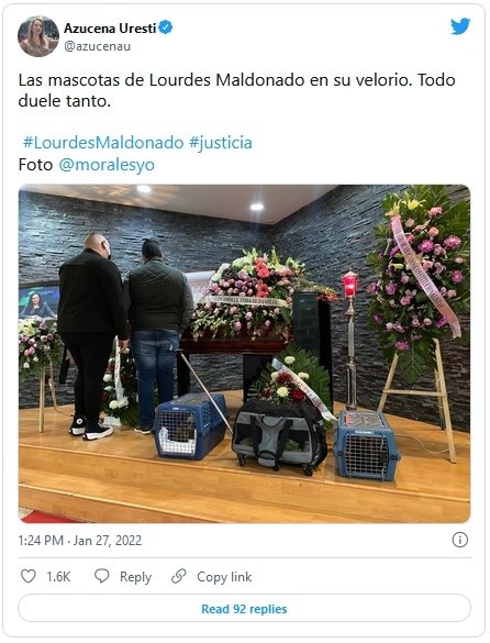 La periodista Lourdes Maldonado fue sepultada este jueves en esta ciudad, acompañada de sus familiares, amigos, colegas y sus mascotas.Maldonado fue asesinada la noche del pasado domingo cuando iba llegando a su domicilio; fue atacada por hombres armados, que le dispararon a la cabeza.La noche del miércoles pasado fue velada en una agencia funeraria.Sus hermanos Carlos y Humberto Maldonado dieron un mensaje en el que perdonaron a los asesinos."Es algo muy difícil para nosotros aceptar que a una persona como a mi hermana a ella le haya sucedido esto, es una desgracia", dijo Humberto Maldonado.Agradeció a los medios y dijo a los reporteros presentes: "cuídense, porque en cualquier momento puede sucederles algo así".Por su parte, Carlos Maldonado dijo que ellos no señalan culpables."Nosotros no apuntamos a culpables… Nosotros lo que queremos es paz y dejamos las responsabilidades a las leyes, al gobierno, que haga su trabajo… Que Dios perdone a las personas, como nosotros perdonamos a las personas que mataron a mi hermana" dijeron.MF
