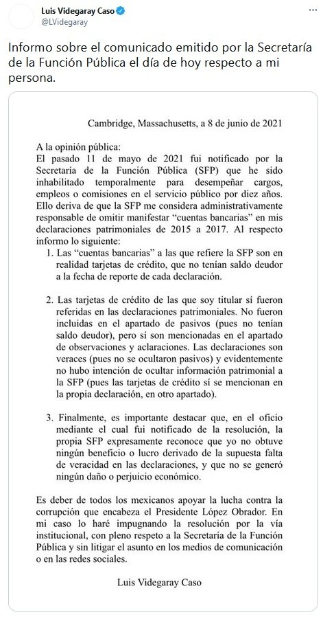 Luis Videgaray, exsecretario de Relaciones Exteriores y de Hacienda del Gobierno mexicano, dijo este martes que impugnará la inhabilitación por 10 años que le impuso la Secretaría de la Función Pública (SFP).La SFP anunció hoy la resolución contra Luis Videgaray, por "acreditarse la falta de veracidad en sus declaraciones patrimoniales de tres años consecutivos" cuando fue secretario durante el Gobierno de Enrique Peña Nieto (2012-2018).A través de un comunicado publicado en redes sociales, Videgaray afirmó que la SFP le notificó sobre la inhabilitación argumentando su responsabilidad al "omitir manifestar 'cuentas bancarias' en mis declaraciones patrimoniales de 2015 a 2017".El exsecretario aseguró que las cuentas referidas se tratan de "tarjetas de crédito, que no tenían saldo deudor a la fecha del reporte de cada declaración" por lo que no se incluyeron como pasivos, pero sí se mencinaron en las declaraciones patrimoniales.Videgaray agregó que en el oficio que le entregaron, la SFP reconoce que no se generó ningún daño o perjuicio económico.“Es deber de todos los mexicanos apoyar la lucha contra la corrupción que encabeza el presidente (Andrés Manuel) López Obrador. En mi caso lo haré impugnando la resolución por la vía institucional, con pleno respeto a la SFP y sin litigar el asunto en los medios de comunicación o en las redes sociales”, explicó al final del comunicado.IM