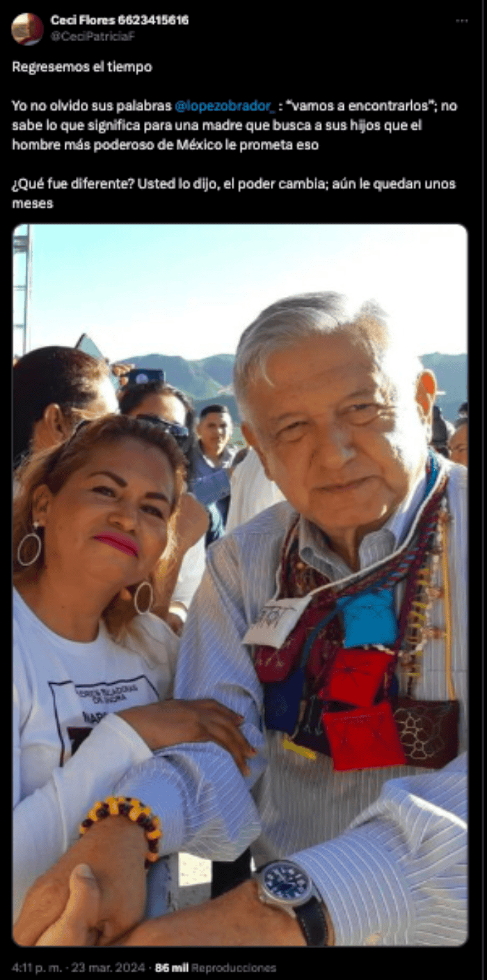 La fundadora del colectivo Madres Buscadoras de Sonora, Ceci Flores, de nueva cuenta compartió la foto que se tomó con el Presidente Andrés Manuel López Obrador y le recordó la promesa que le hizo: "vamos a encontrarlos".A través de su cuenta de X, Ceci Flores, comentó que "No sabe lo que significa para una madre que busca a sus hijos que el hombre más poderoso de México le prometa eso".Además, lo cuestionó: "¿Qué fue diferente?", y le aseguró que efectivamente "el poder cambia"; sin embargo, lo invitó a cumplir su promesa."Aún le quedan unos meses", le escribió la madre buscadora.El lunes pasado, Ceci Flores protestó afuera de Palacio Nacional para entregarle personalmente al Presidente Andrés Manuel López Obrador la pala con la que busca a sus hijos."Yo le quiero entregar a él también esta pala con la que he escarbado la tierra en diferentes partes del país para que él también haga su trabajo, porque esta pala no debería estar en mis manos nunca, pero la tuve que agarrar por necesidad por encontrar a mis hijos."Le vengo a entregar al Presidente la pala para que él sea el que se encargue de hacer la búsqueda, investigación y localización de mis desaparecidos y no tenga que estar arriesgando mi vida constantemente en esta lucha porque a él le corresponde", dijo la madre buscadora.Después de vestirse como beisbolista para tratar de ser recibida por el presidente Andrés Manuel López Obrador, la madre buscadora Ceci Flores informó que hará la ficha de búsqueda del titular del Ejecutivo.La fundadora del colectivo madres buscadoras de Sonora buscó entrar a Palacio Nacional por segundo día consecutivo para entregar a López Obrador la pala de mando con la que busca a sus desaparecidos."Vamos a hacer una ficha de búsqueda de él, que lo estamos buscando y cuando desapareció al entrar al Palacio de gobierno", expresó Ceci Flores.NA