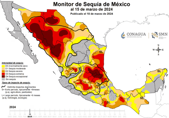 Conforme a datos de investigación del Servicio Meteorológico de la Comisión Nacional del Agua (Conagua) son al menos seis estados incrementaron sus niveles de sequía en marzo, lo que agudiza la crisis de agua.En el primer trimestre, los niveles de sequía en México incrementaron, llegando a 26.03 por ciento en estado de sequía extrema o excepcional, esto quiere decir que más de una cuarta parte del país se enfrenta a niveles alarmantes, misma que se concentra en el noroeste y centro de México, mientras que hay otro 31.47 por ciento del territorio que tiene sequía de moderada a severa.Sólo el 25.57 por ciento del país no tiene problemas de sequía, es decir que apenas una cuarta parte del país está en condiciones normales, mientras los demás se enfrentan a una reducción en los niveles de agua.Los sitios en los que incrementaron los índices de sequía y sequía extrema son:Conagua indica que existen sólo 125 presas en el país con menos de la mitad de almacenamiento.Según los indicadores de Conagua, la sequía excepcional es la más aguda de todas, mientras que la extrema es la siguiente. En ese sentido, te mostramos el mapa de las zonas afectadas.Los Estados que en alguna de sus regiones presentan sequía extrema o excepcional son:EE