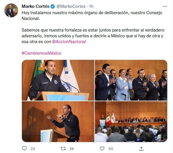 "En 2024 concluiremos con más de tres gobernadoras y vamos por más de Acción Nacional", aseguró el presidente nacional del PAN, Marko Cortés Mendoza.Durante una reunión con consejeras nacionales, el dirigente anunció que nombraron una comisión especial de atención de género que estará pendiente de la competitividad, a fin de que las mujeres vayan a distritos ganadores, así como garantizar que las asignaciones sean más equitativas y prevenir y erradicar la violencia política en razón de género.Por su parte, la secretaria de Promoción Política de la Mujer, Laura Esquivel Torres, señaló que deben buscar a las mejores mujeres y más echadas para adelante, porque las van a necesitar en 2024.Cecilia Patrón, secretaria general del PAN, puntualizó que, en el marco del día de los derechos humanos, Acción Nacional tiene que ser ejemplo de lucha de los derechos de las mujeres, ser sororas e impulsar a otras mujeres.JM
