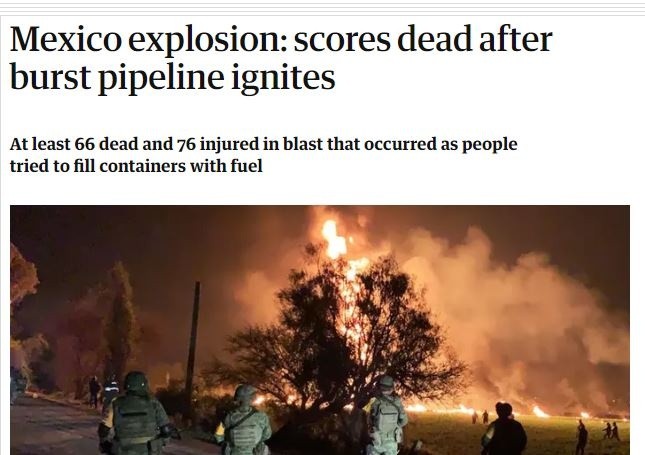 Luego de semanas de la estrategia de lucha en contra del Huachicoleo implementada por el Presidente Andrés Manuel López Obrador, la explosión en el ducto de Tlahuelilpan, Hidalgo, llamó la atención no solo de México, sino de los medios internacionales.A través de sus ediciones impresas y de sus portales web medios de comunicación en distintas partes del mundo han hecho eco de esta tragedia.El diario The New York Times, en Estados Unidos, publicó una pieza titulada "Explosión en México mata a 66 después de que ladrones perforaran un gasoducto", acompañado de videos y fotografías, y destacan lo que dijo esta mañana el Presidente López Obrador de que continuará con la lucha en contra del robo de combustibles: "El presidente de México juró este sábado que redoblará su lucha contra la epidemia de robo de gasolina, luego de que una fuga causara una explosión que mató a 66 personas y dejó a 76 heridos..."El diario The Washington Post también destaca en su encabezado el número de víctimas que dejó este hecho y agregan que, el robo de combustible, deja pérdidas cercanas a los tres mil millones de dólares al año: "A inicios de este mes, Andrés Manuel López Obrador cerró la mayoría de los ductos de gasolina dejando a docenas de ciudades con un desabasto de combustible".En Reino Unido, The Guardian publicó: "Se registran víctimas mortales luego del incendio en un gasoducto". En la pieza hacen mención de que "el origen de la explosión sigue sin confirmarse, pero trajo consigo los horrores del robo de combustible hecho mediante los dictos de la compañía petrolera Pemex".Uno de los rotativos más importantes en Francia, "Le Monde", también replicó la noticia: "Varios muertos y heridos en explosión de oleoducto en México".Además de resaltar el robo de combustibles, hablaron de la atención por parte de los cuerpos de bomberos y ambulancias que llegaron al lugar: "Las unidades de bomberos y ambulancias de la petrolera estatal Pemex, que tiene una refinería al lado, llegaron al lugar para atender a las víctimas".En América Latina, el periódico El Tiempo, de Colombia también se enfocó en el número de muertos que se han confirmado hasta el momento titulando "Cerca de 66 muertos y más de 70 heridos deja explosión en México" y narran el momento del accidente: "Al estallar, el combustible creó una especie de barrera de fuego donde se encontraba la mayor cantidad de personas. Es en este punto donde las autoridades creen que puede haber más personas fallecidas ya que era el sitio donde había más combustible."OF