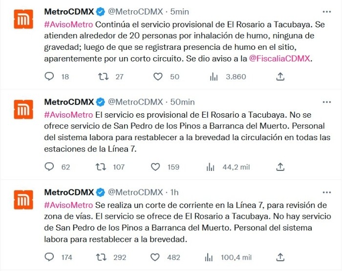 El Metro informó que personal de Transportación y Seguridad Institucional coordinaron el desalojo de usuarios en la estación Barranca del Muerto de la Línea 7 luego de que se registrara presencia de humo en el sitio, aparentemente por un cortocircuito.Indicó que personal del área jurídica del Metro dio aviso a la Fiscalía General de Justicia para que realice las investigaciones correspondientes.En una tarjeta informativa mencionó que de forma inmediata se coordinó el envío de elementos de Protección Civil para apoyar a los usuarios que requirieran apoyo, derivado del incidente. Alrededor de 20 personas están en atención por inhalación de humo, ninguna de gravedad.En el sitio personal de instalaciones fijas y material rodante laboran para restablecer el servicio de la Línea 7, que al momento se ofrece únicamente de El Rosario a Tacubaya.Las estaciones que están sin servicio corresponden al tramo Barranca del Muerto-San Pedro de los Pinos."El área de incidentes relevantes tomó conocimiento de la situación para la investigación del origen del incidente", indicó el Metro.JM