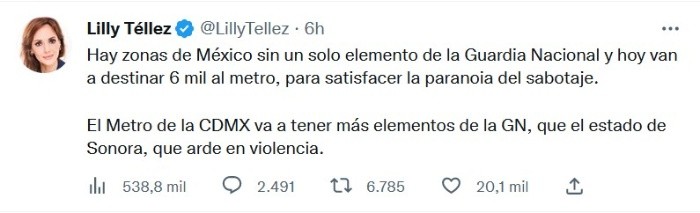 El despliegue de más de seis mil elementos de la Guardia Nacional en el Metro de Ciudad de México levantó polémica este jueves porque organizaciones civiles y políticos de oposición acusaron al Gobierno de militarizar el sistema de transporte."El anuncio de que la militarizada Guardia Nacional será desplegada en el metro de la CDMX es preocupante pues es patente que esta corporación reproduce las inercias castrenses de opacidad y uso excesivo de la fuerza", expresó el Centro de Derechos Humanos Miguel Agustín Pro Juárez (Centro Prodh) en un posicionamiento.La controversia inició en la conferencia matutina del Presidente Andrés Manuel López Obrador, en la que la jefa de Gobierno de Ciudad de México, Claudia Sheinbaum, informó del apoyo de los elementos tras el accidente que dejó una joven de 18 años muerta y más de 100 heridos el sábado pasado.Al negar la acusación de que ha reducido el mantenimiento, Sheinbaum justificó la vigilancia de la Guardia Nacional por "episodios fuera de lo normal" en el Metro."Vamos a tener vigilancia y si a eso le llaman militarización, o como le llamen, asumimos la responsabilidad, porque vale más prevenir que lamentar. Entonces, vamos a cuidar al pueblo en el Metro", añadió López Obrador.Pero la oposición acusó al Gobierno de usar a la Guardia Nacional como distracción de los problemas del Metro, que vivió su más trágico accidente en mayo de 2021, cuando un tren elevado en la línea 12 dejó 26 muertos y cerca de 100 heridos tras colapsar en la alcaldía de Tláhuac."(Usar a) seis milelementos de la Guardia Nacional como cortina de humo, lo quiero insistir, para decir que en el metro está pasando algo extraño, es evadir el problema", comentó en un video Salomón Chertorivski, diputado de Ciudad de México por Movimiento Ciudadano (MC).Mientras que senadoras del Partido Acción Nacional (PAN) criticaron que haya más elementos de la Guardia Nacional en el Metro de la capital que en estados azotados por la violencia del narcotráfico."Hay zonas de México sin un solo elemento de la Guardia Nacional y hoy van a destinar seis mil al Metro, para satisfacer la paranoia del sabotaje. El Metro va a tener más elementos de la Guardia Nacional que el estado de Sonora, que arde en violencia", cuestionó la senadora Lilly Téllez.JM