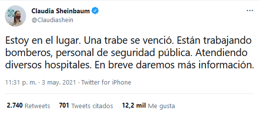 La jefa de gobierno de la CDMX, Claudia Sheinbaum, ofreció información luego del colapso de un puente entre las estaciones Olivos y Tezonco, que hasta el momento ha dejado 15 personas muertas y 70 lesionados.En rueda de prensa, Sheinbaum expresó: "Lamentablemente, lo que ocurrió fue el vencimiento de una trabe en el momento en que iba pasando un tren. Se van a hacer todas las investigaciones hasta saber cuales son las causas".Además, señaló que 34 personas fueron trasladadas a distintos hospitales de la CDMX, y que momentáneamente se suspendió el rescate debido a que un vagón se encontraba muy frágil, por lo que se tuvo que pedir una grúa que lo detuviera.Al interior aún se encontrarían personas, aunque no se sabe con certeza si se trata de heridos, sin embargo, no descartan que haya más fallecidos.GC